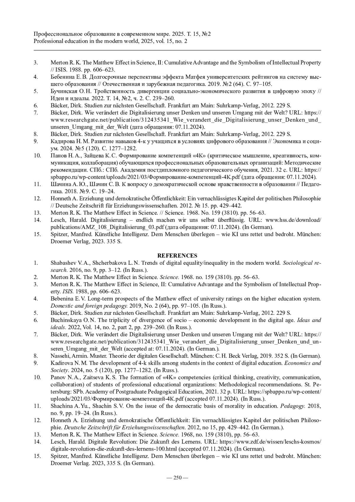 4. Бебенина Е.В. Долгосрочные перспективы эффекта Матфея университетских рейтингов на систему высшего образования // Отечественная и зарубежная педагогика. 2019. № 2 (64). С. 97-105.