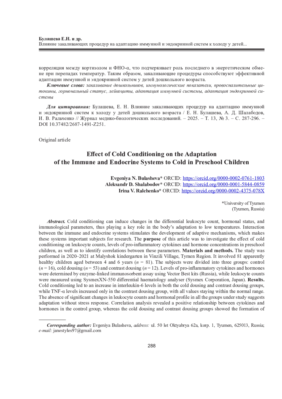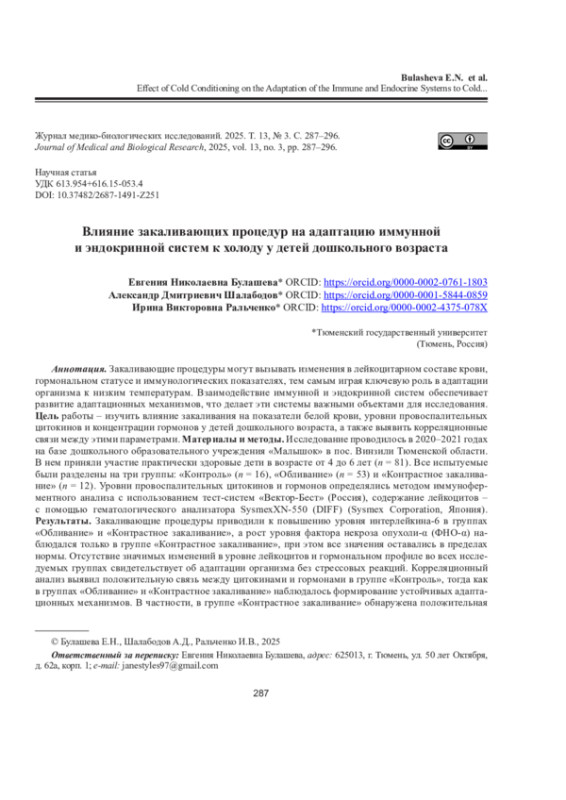 Закаливающие процедуры могут вызывать изменения в лейкоцитарном составе крови, гормональном статусе и иммунологических показателях, тем самым играя ключевую роль в адаптации организма к низким температурам. Взаимодействие иммунной и эндокринной систем обеспечивает развитие адаптационных механизмов, что делает эти системы важными объектами для исследования. Цель работы - изучить влияние закаливания на показатели белой крови, уровни провоспалительных цитокинов и концентрации гормонов у детей дошкольного возраста, а также выявить корреляционные связи между этими параметрами.