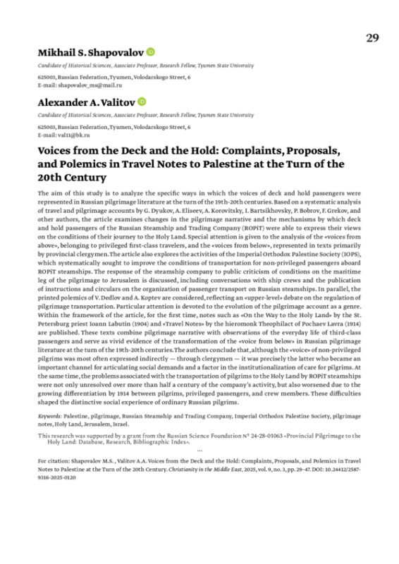 The aim of this study is to analyze the specific ways in which the voices of deck and hold passengers were represented in Russian pilgrimage literature at the turn of the 19th–20th centuries. Based on a systematic analysis of travel and pilgrimage accounts by G. Dyukov, A. Eliseev, A. Korovitsky, I. Bartsikhovsky, P. Bobrov, F. Grekov, and other authors, the article examines changes in the pilgrimage narrative and the mechanisms by which deck and hold passengers of the Russian Steamship and Trading Company (ROPiT) were able to express their views on the conditions of their journey to the Holy Land. Special attention is given to the analysis of the «voices from above», belonging to privileged first-class travelers, and the «voices from below», represented in texts primarily by provincial clergymen. The article also explores the activities of the Imperial Orthodox Palestine Society (IOPS), which systematically sought to improve the conditions of transportation for non-privileged passengers aboard ROPiT steamships. The response of the steamship company to public criticism of conditions on the maritime leg of the pilgrimage to Jerusalem is discussed, including conversations with ship crews and the publication of instructions and circulars on the organization of passenger transport on Russian steamships. In parallel, the printed polemics of V. Dedlov and A. Koptev are considered, reflecting an «upper-level» debate on the regulation of pilgrimage transportation. Particular attention is devoted to the evolution of the pilgrimage account as a genre. Within the framework of the article, for the first time, notes such as «On the Way to the Holy Land» by the St. Petersburg priest Ioann Labutin (1904) and «Travel Notes» by the hieromonk Theophilact of Pochaev Lavra (1914) are published. These texts combine pilgrimage narrative with observations of the everyday life of third-class passengers and serve as vivid evidence of the transformation of the «voice from below» in Russian pilgrimage literature at the turn of the 19th–20th centuries. The authors conclude that, although the «voice» of non-privileged pilgrims was most often expressed indirectly — through clergymen — it was precisely the latter who became an important channel for articulating social demands and a factor in the institutionalization of care for pilgrims. At the same time, the problems associated with the transportation of pilgrims to the Holy Land by ROPiT steamships were not only unresolved over more than half a century of the company’s activity, but also worsened due to the growing differentiation by 1914 between pilgrims, privileged passengers, and crew members. These difficulties shaped the distinctive social experience of ordinary Russian pilgrims.