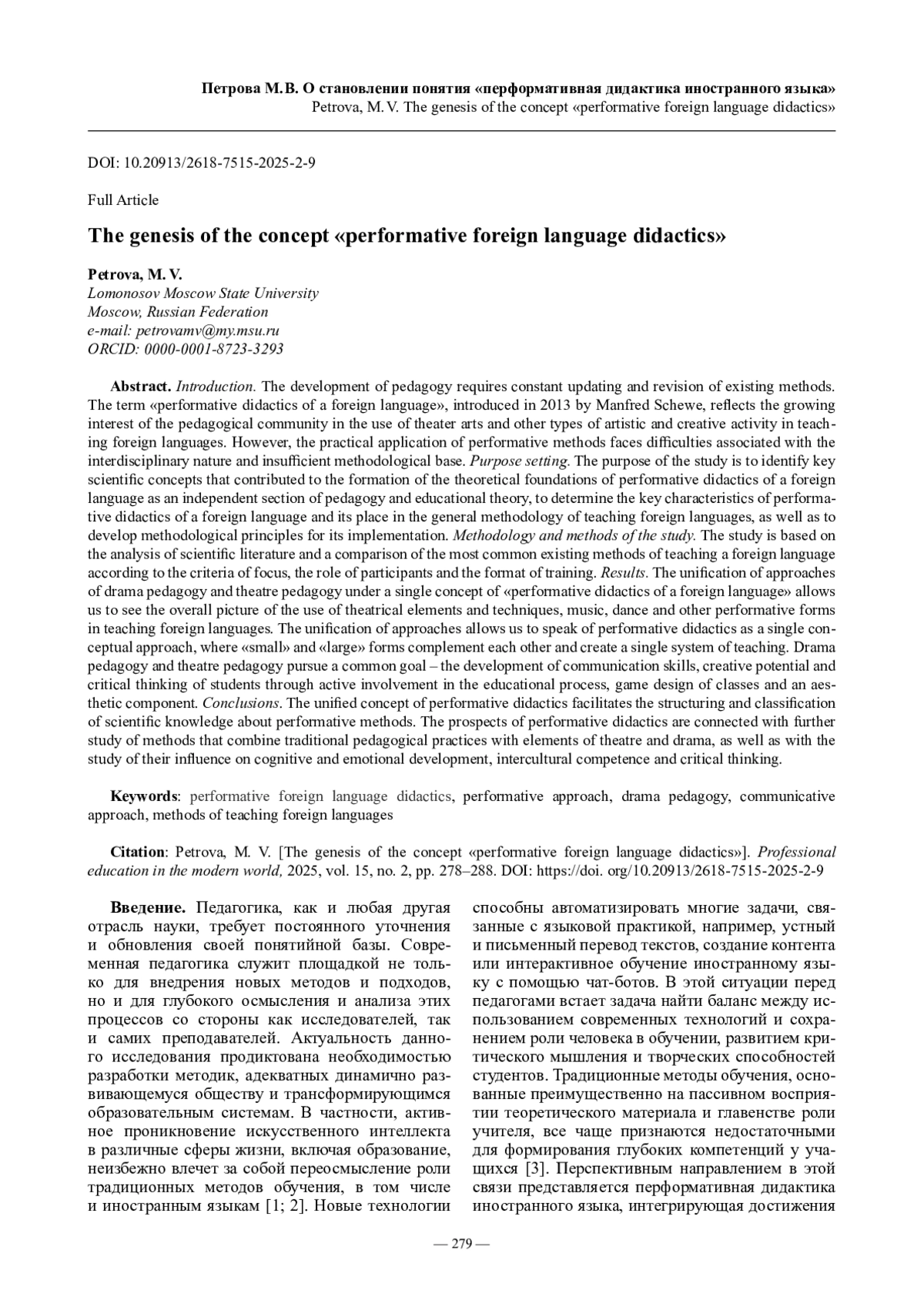 Введение. Развитие педагогики требует постоянного обновления и пересмотра существующих методик. Введенный в 2013 г. М. Шеве термин «перформативная дидактика иностранного языка» отражает растущий интерес педагогического сообщества к использованию театрального искусства и других видов художественно-творческой деятельности в обучении иностранным языкам. Однако практическое применение перформативных методик сталкивается с трудностями, связанными с междисциплинарным характером и недостаточной методической базой.