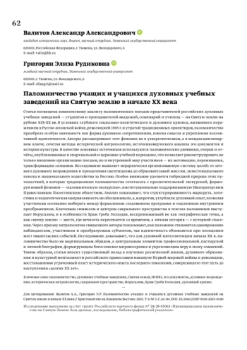 12. Валитов А.А., Кибардина Т.А. Воспоминания сибирских паломников о Палестине конца XIX - начала ХХ веков как исторический источник // Научный диалог. 2019. № 4. С. 213-224.