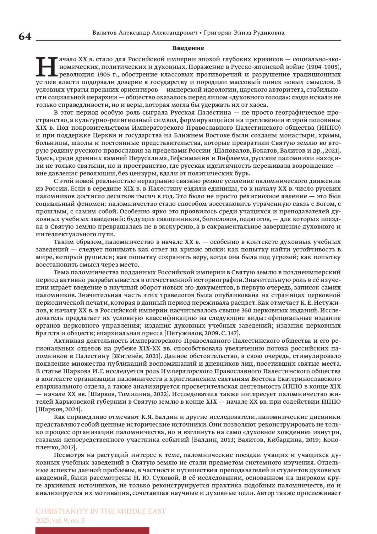 24. Житенёв С. Ю. Русское православное паломничество в Святую Землю и деятельность ИППО // Христианство на Ближнем Востоке. 2021. Т. 5. № 2. С. 5-21.