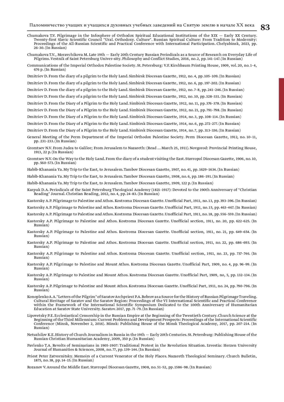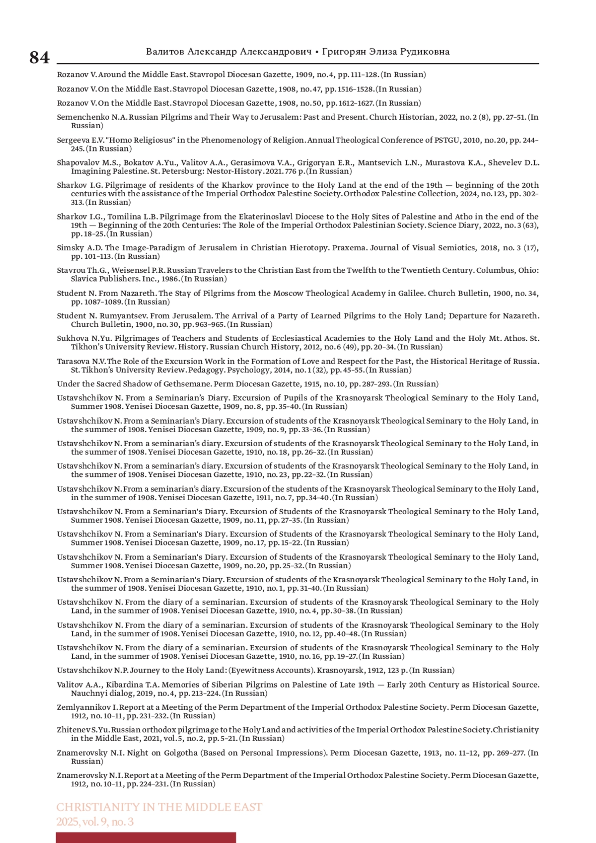 50. Семенченко Н. А. Путь русских паломников в Иерусалим: прошлое и настоящее // Церковный историк. 2022. № 2 (8). С. 27-51.