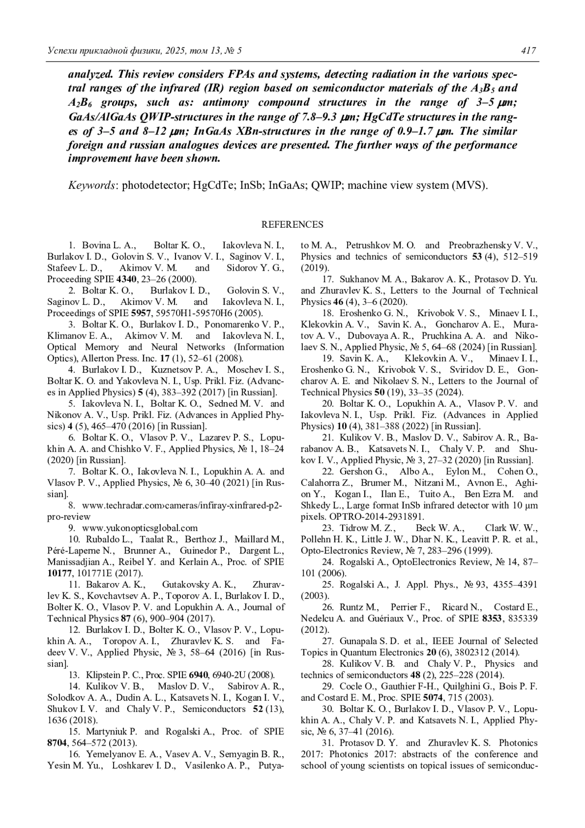 - Boltar K. O., Burlakov I. D., Golovin S. V., Saginov L. D., Akimov V. M., Iakovleva N. I. / Proceedings of SPIE. 2005. Vol. 5957. P. 59570H1-59570H6.