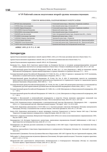 Статья с публикацией источников посвящена реконструкции уникального исторического кейса — подготовки весной-летом 1955 г. первой группы монахинь и послушниц для пополнения «русского» Горненского монастыря в Иерусалиме. Все обстоятельства этого важного с позиции государственных органов (Совета по делам Русской православной церкви при Совете министров СССР) и церковных структур дела воссоздаются благодаря выявлению и параллельной публикации источников из различных фондов. Обнаруженные в ходе историко-биографического исследования в личном архиве митрополита Волоколамского и Юрьевского Питирима (Нечаева) документы о его участии в подготовке группы монашествующих для отправки в Иерусалим дали толчок к выявлению и комплексной публикации всех источников, связанных с этим проектом, отложившихся в фонде Совета по делам Русской православной церкви при Совете Министров СССР (фонд Р-6991 Государственного архива Российской Федерации) и Архива отдела внешних церковных связей Московского патриархата. Собранный комплекс источников представил обстоятельства важного события в истории Горненского монастыря в нескольких репрезентативных аспектах: в истории государственно-церковных отношений, церковной дипломатии, российского христианства на Святой земле. Необычный по динамизму и наполненности событиями 1955 г. принес значительные изменения в подходах как Московской патриархии, так и правительственных структур к задачам и практикам российского/советского присутствия на Ближнем Востоке (было осознано, что решать задачи поддержания и развития церковного достояния без людей — невозможно); способствовал вовлечению в активную церковно-дипломатическую работу ряда молодых церковных деятелей — протоиерея Михаила Зёрнова, Константина Нечаева, архимандрита Пимена (Хмелевского).