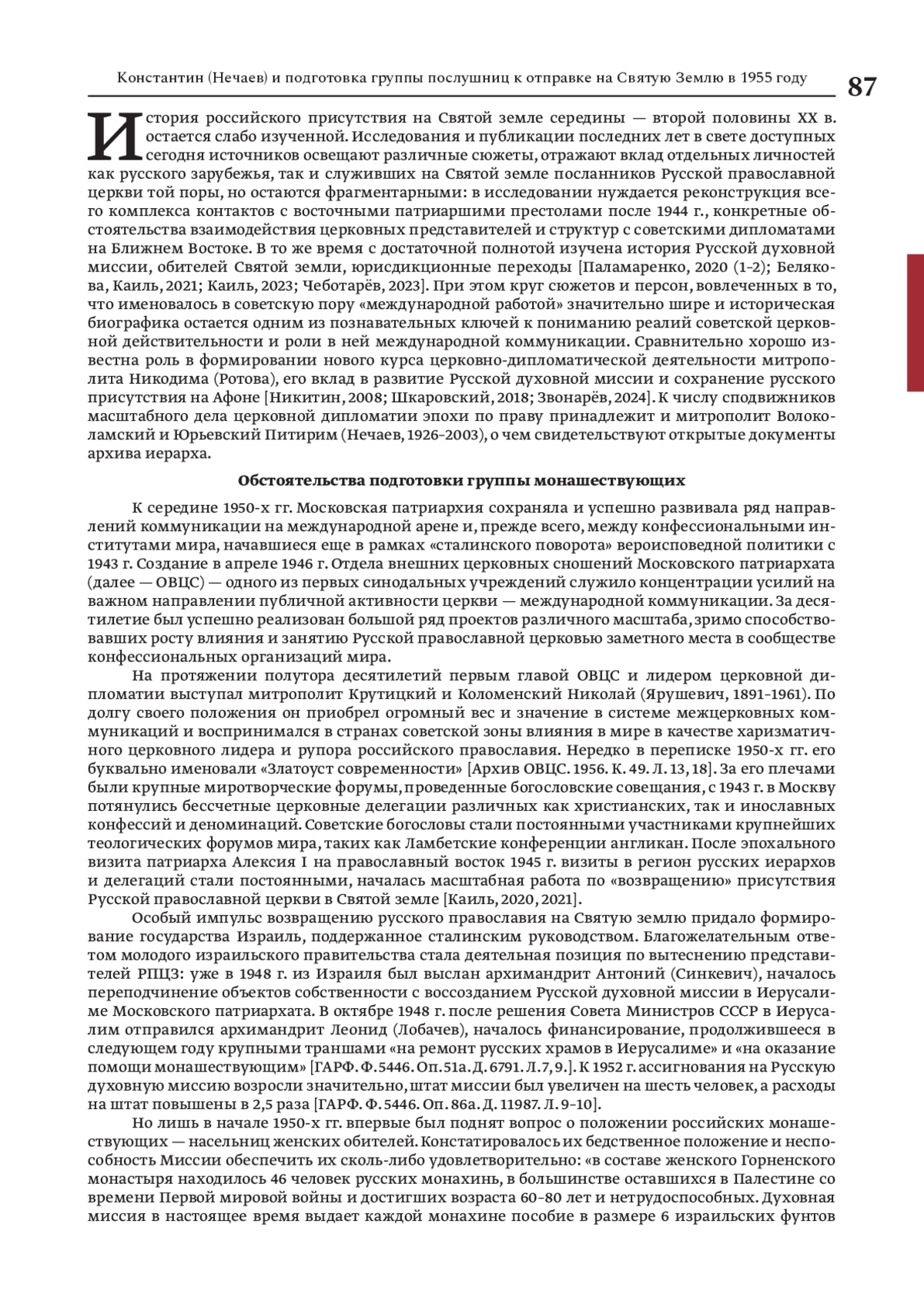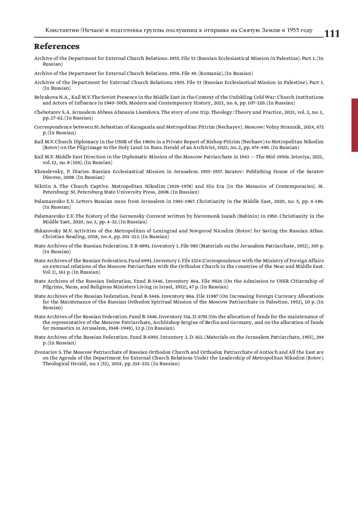 13. Каиль М.В. Церковная дипломатия в СССР 1960-х гг. в частном рапорте епископа Питирима (Нечаева) митрополиту Никодиму (Ротову) о паломничестве в Святую Землю // Вестник архивиста. 2023. № 2. С. 474-490.