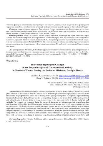 Персонализированное изучение адаптационных эндокринных механизмов, связанных с регуляцией функций щитовидной железы и надпочечников, остается одним из самых актуальных вопросов физиологических исследований в условиях Севера. Исходя из этого, целью работы явилось изучение типологических реакций периферического дофамина в период минимального светового дня и сопутствующих изменений уровней тиреоидных гормонов, кортизола и аутоантител к тканям щитовидной железы у молодых жительниц Европейского Севера России.
