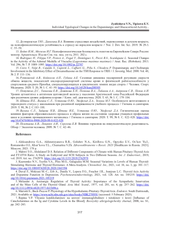 11. Зябишева В.Н., Типисова Е.В., Елфимова А.Э., Молодовская И.Н., Аликина В.А. Типологические изменения уровня дофамина, кортизола и тиреоидных гормонов у мужчин г. Архангельска в динамике фотопериодов года // Сиб. науч. мед. журн. 2023. Т. 43, No 6. С. 63-69. DOI: 10.18699/SSMJ20230607 EDN: HPENZR