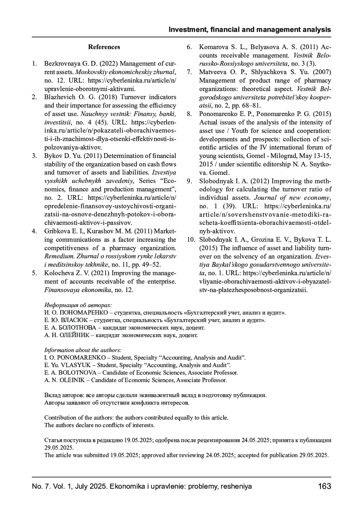 2. Блажевич О. Г. Показатели оборачиваемости и их значимость для оценки эффективности использования активов // Научный вестник: Финансы, банки, инвестиции. 2018. № 4 (45). URL: https://cyberleninka.ru/article/n/pokazateli-oborachivaemosti-i-ih-znachimostdlya-otsenki-effektivnosti-ispolzovaniya-aktivov. EDN: YRNTAD