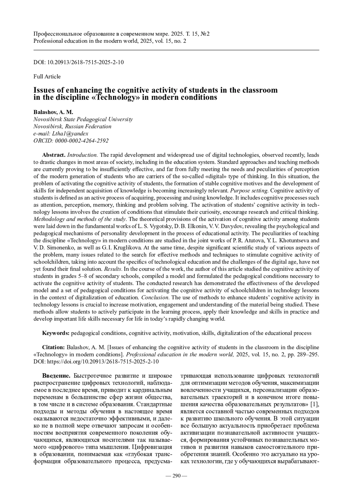 БАЛАШОВ А. М. ВОПРОСЫ АКТИВИЗАЦИИ ПОЗНАВАТЕЛЬНОЙ АКТИВНОСТИ ОБУЧАЮЩИХСЯ НА ЗАНЯТИЯХ ПО ДИСЦИПЛИНЕ «ТЕХНОЛОГИЯ» // ПРОФЕССИОНАЛЬНОЕ ОБРАЗОВАНИЕ В СОВРЕМЕННОМ МИРЕ. 2025. Т. 15, № 2