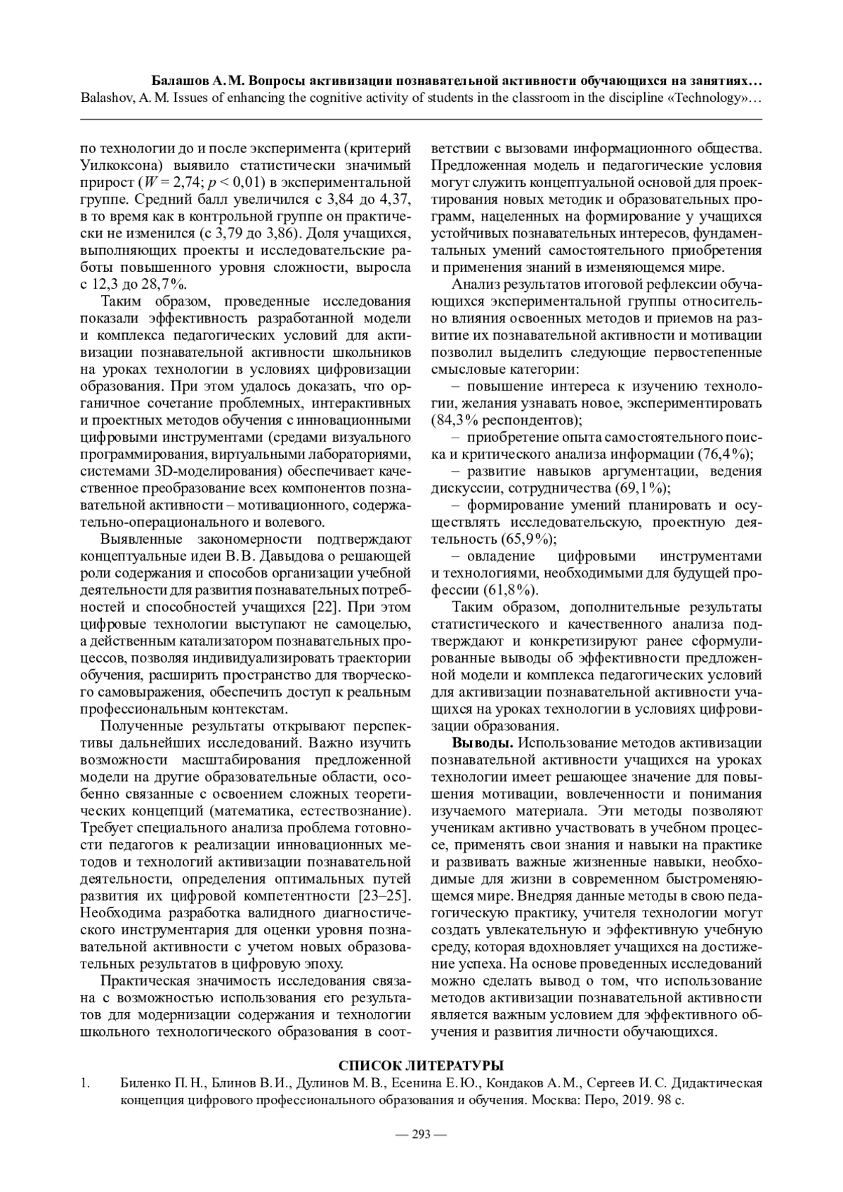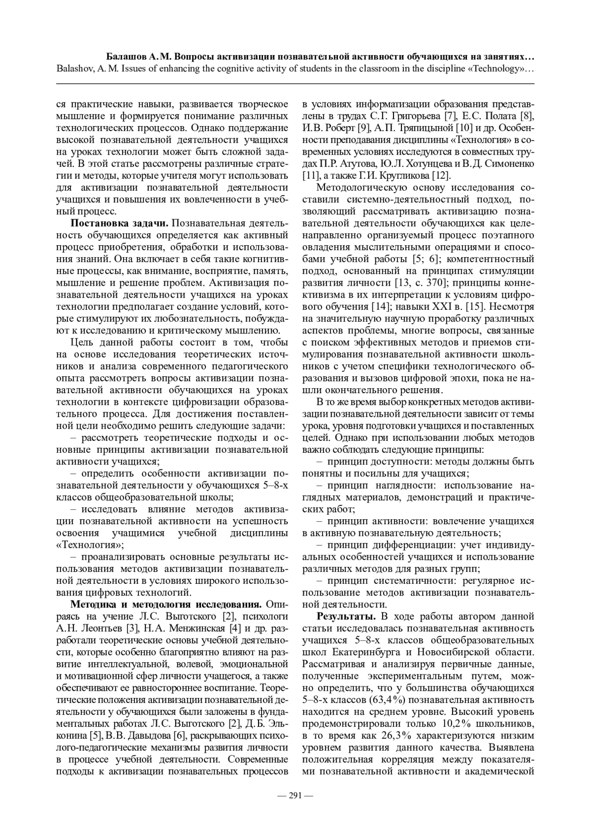Методика и методология исследования. Теоретические положения активизации познавательной деятельности у обучающихся были заложены в фундаментальных работах Л. С. Выготского, Д. Б. Эльконина, В. В. Давыдова, раскрывающих психолого-педагогические механизмы развития личности в процессе учебной деятельности. Особенности преподавания дисциплины «Технология» в современных условиях исследуются в совместных трудах П. Р. Атутова, Ю. Л. Хотунцева и В. Д. Симоненко, а также Г. И. Кругликова. В то же время, несмотря на значительную научную проработку различных аспектов проблемы, многие вопросы, связанные с поиском эффективных методов и приемов стимулирования познавательной активности школьников с учетом специфики технологического образования и вызовов цифровой эпохи, пока не нашли окончательного решения.