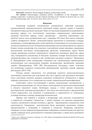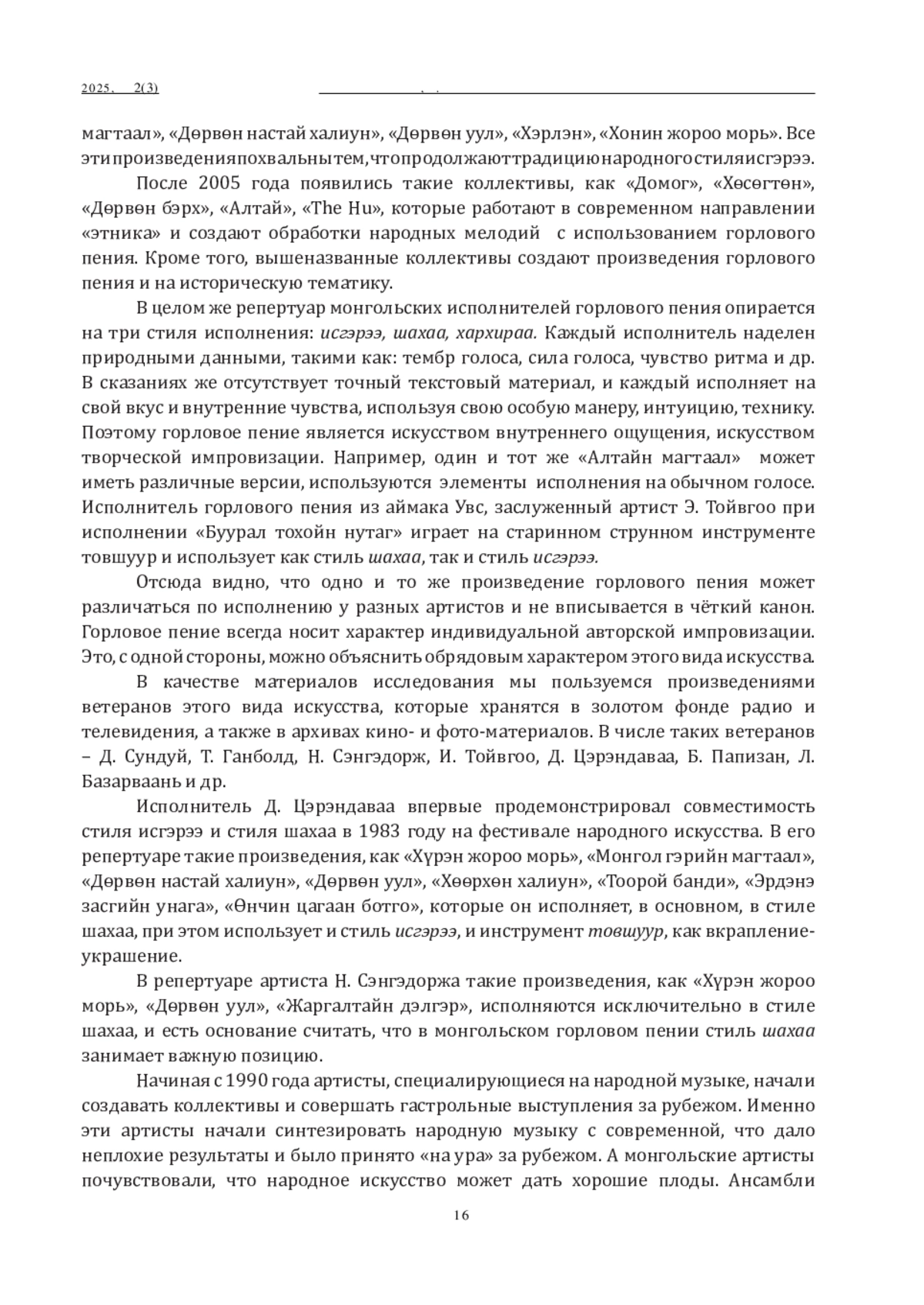 Горловое пение – это уникальный вид искусства монголов, который детерминирован природными, социальными и бытовыми факторами. Горловое пение издавна применялось в обрядах, ритуалах, служило средством общения не только в сфере скотоводства, но и с окружаящим миром и природой. Мы поставили своей целью определить особенности репертуара горлового пения в зависимости от определенного исторического периода, в том числе особенности репертуара исполнителей, тематику, технику исполнения, манеру исполнения, а также значимость, функции и тенденции развития данного вида искусства. Монголы в жанре горлового пения создали уникальные звучания, мелодии, в этом плане горловое пение является особым культурным символом, метафорой, выражением мировоззрения.