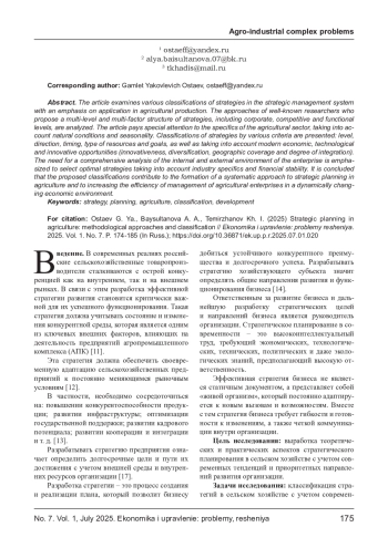 В статье рассматриваются различные классификации стратегий в системе стратегического управления с акцентом на применение в сельскохозяйственном производстве. Анализируются подходы известных исследователей, которые предлагают многоуровневую и многофакторную структуру стратегий, включающую корпоративные, конкурентные и функциональные уровни. В статье особое внимание уделяется специфике аграрного сектора, учитывающей природные условия и сезонность. Представлены классификации стратегий по различным признакам: уровню, направлению, срокам, типу ресурсов и целям, а также с учетом современных экономических, технологических и инновационных возможностей (инновационность, диверсификация, географический охват и степень интеграции). Подчеркивается необходимость комплексного анализа внутренней и внешней среды предприятия для выбора оптимальных стратегий с учетом отраслевой специфики и финансовой устойчивости. Сделан вывод, что предложенные классификации способствуют формированию системного подхода к стратегическому планированию в сельском хозяйстве и повышению эффективности управления аграрными предприятиями в условиях динамично меняющейся экономической среды.
