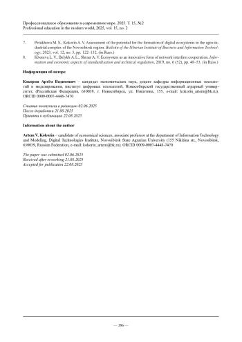 7. Петухова М.С., Кокорин А.В. Оценка потенциала формирования цифровых экосистем в АПК Новосибирской области // Вестник Сибирского института бизнеса и информационных технологий. 2023. Т. 12, № 3. С. 122-132.