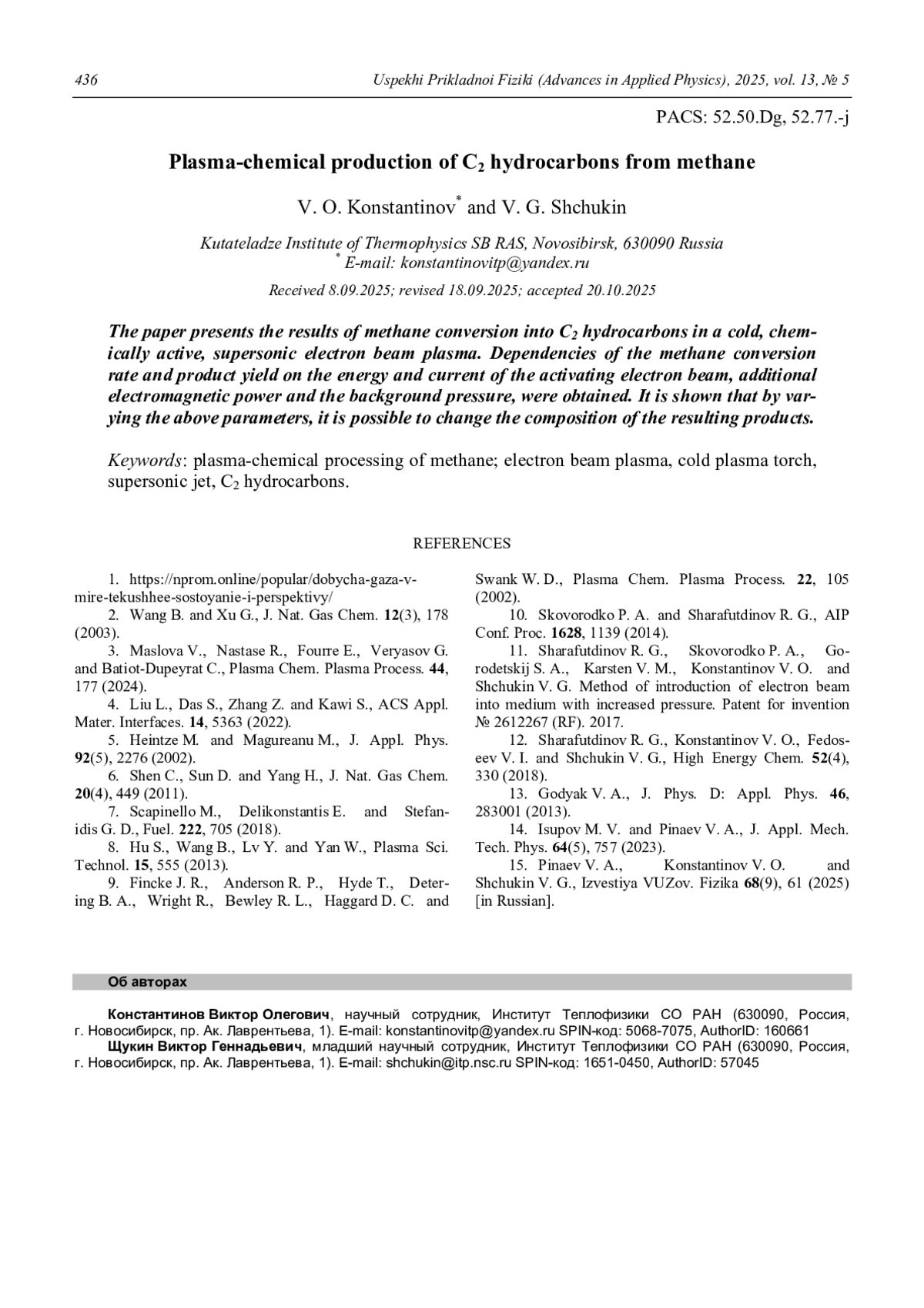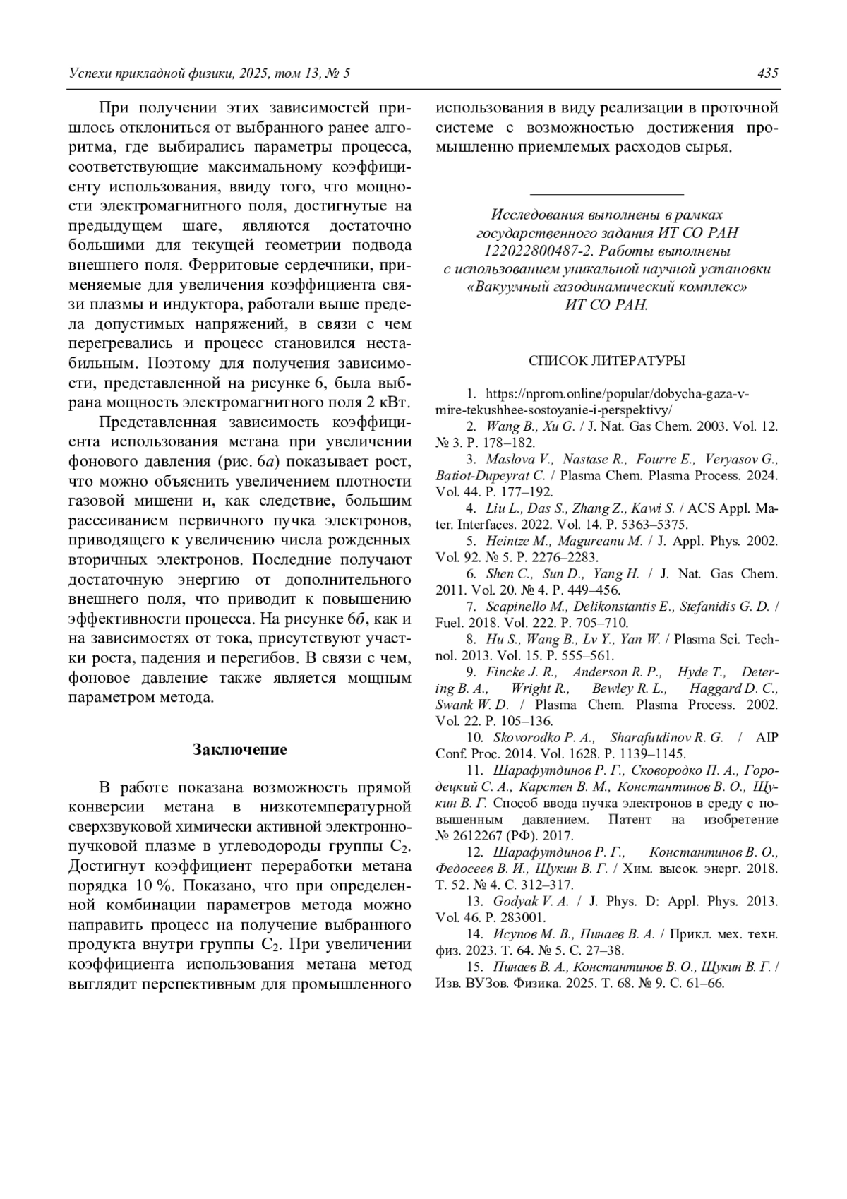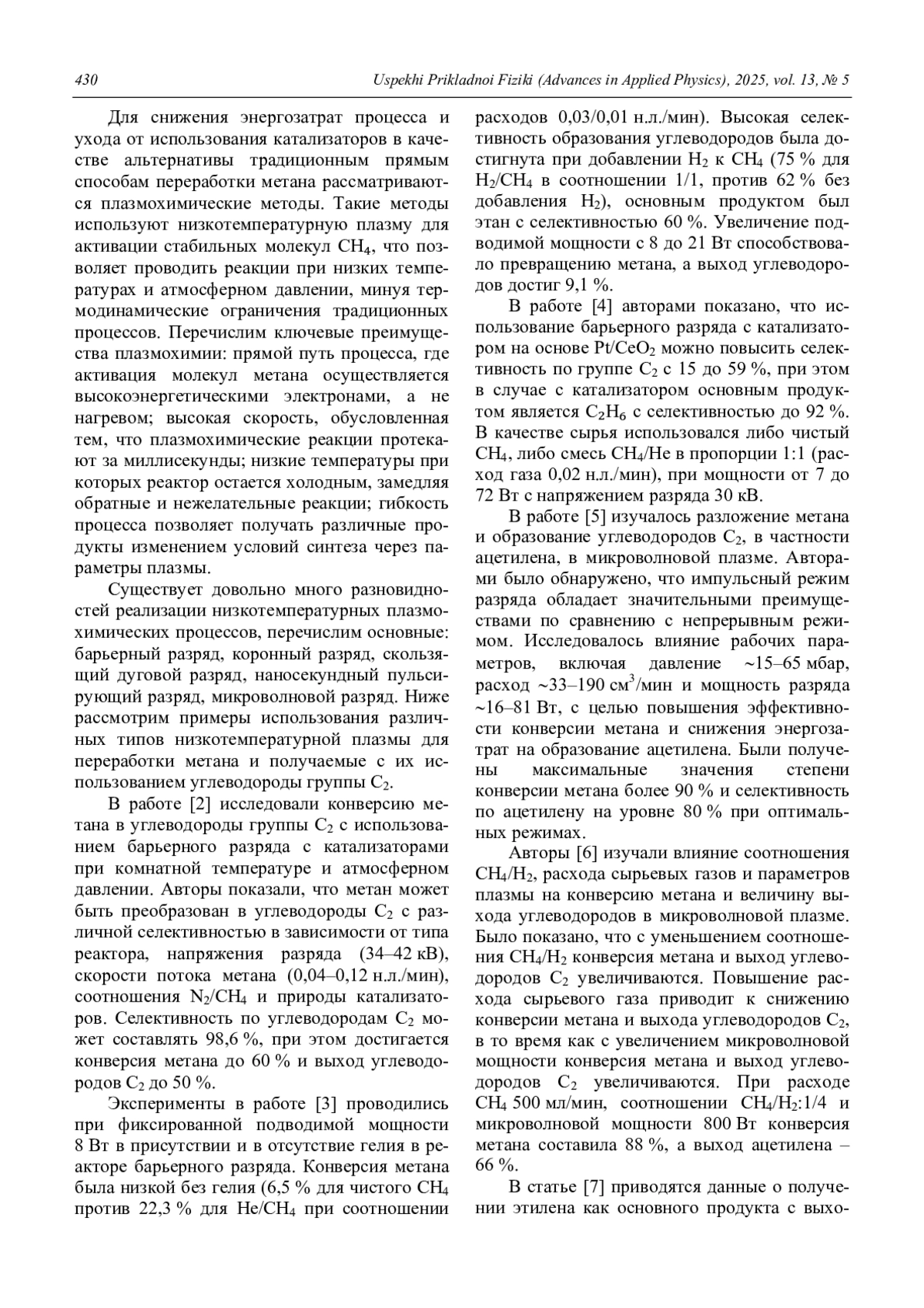 КОНСТАНТИНОВ В. О., ЩУКИН В. Г. ПЛАЗМОХИМИЧЕСКОЕ ПОЛУЧЕНИЕ УГЛЕВОДОРОДОВ ГРУППЫ С2 ИЗ МЕТАНА // УСПЕХИ ПРИКЛАДНОЙ ФИЗИКИ. 2025. №5