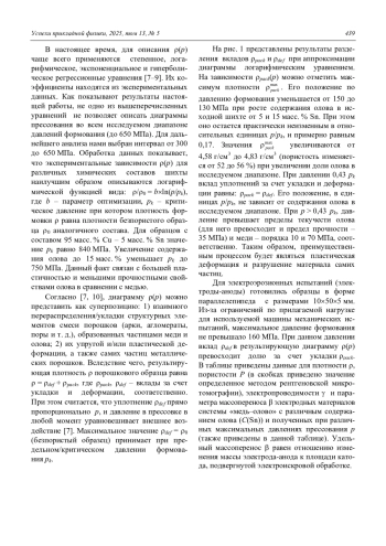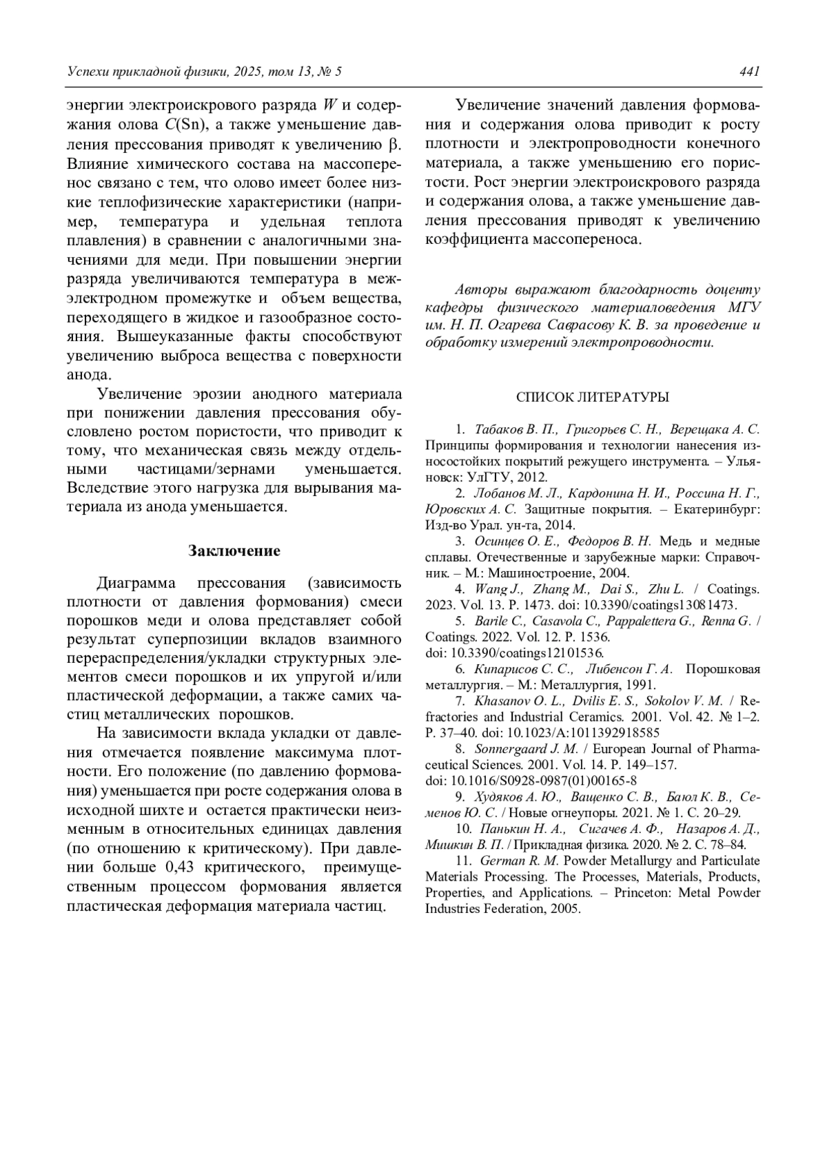 Определены плотность, пористость, электропроводность и коэффициент массопереноса (при электроискровой обработке) порошковых электродных материалов системы «медь – олово». Они были получены методом холодного одностороннего формования смеси порошков металлов в закрытой пресс-форме. Диаграмма «плотность – давление прессования» является суперпозицией взаимного перераспределения/укладки структурных элементов порошкового материала и их упругой/пластической деформации. Определены критические давления формования (при аппроксимации логарифмической функцией). На зависимости от давления вклада укладки имеется максимум. Он смещается в область малых давлений формования при росте содержания олова в исходной шихте. В относительных единицах давления (по отношению к критическому) его положение остается практически неизменным. Увеличение давления формования и содержания олова приводит к росту плотности и электропроводности конечного материала, а также уменьшению его пористости. Рост энергии электроискрового разряда и содержания олова, а также уменьшение давления прессования приводят к увеличению коэффициента массопереноса.