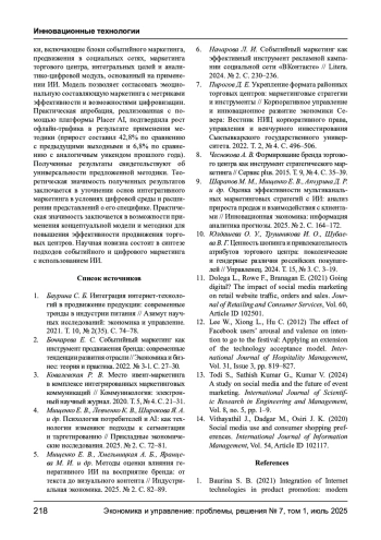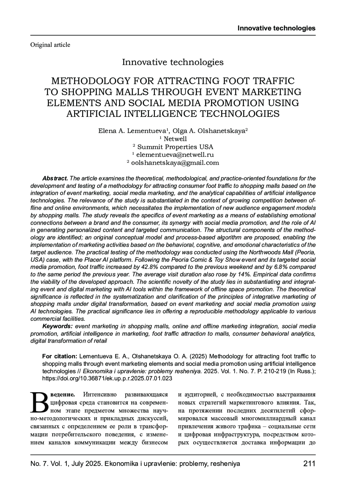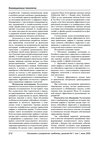 Статья посвящена рассмотрению теоретико-методологических и практико-ориентированных оснований разработки и апробации методики привлечения потребительского трафика в торговые центры на основе интеграции событийного маркетинга, маркетинга в социальных сетях и аналитических возможностей технологий искусственного интеллекта. Обосновывается актуальность исследования в условиях усиливающейся конкуренции между офлайн- и онлайн-средой, что определяет необходимость внедрения новых моделей взаимодействия с аудиторией. В рамках исследования раскрыта специфика событийного маркетинга как средства формирования эмоциональной связи между брендом и потребителем, его синергии с продвижением в социальных сетях, а также роль искусственного интеллекта (ИИ) в формировании персонализированного контента и таргетированной коммуникации. Выделяются структурные компоненты методики, предлагается авторская концептуальная модель и процессный алгоритм, позволяющие реализовать маркетинговые активности с учетом поведения, когнитивных и эмоциональных характеристик целевой аудитории. Практическая апробация разработанной методики проведена на примере торгового центра Northwoods Mall (г. Пеория, США) с использованием платформы Placer AI. В результате реализации события Peoria Comic & Toy Show и его целевого продвижения в социальных сетях зафиксирован рост посещаемости на 42,8% по сравнению с предыдущими выходными и на 6,8% по сравнению с аналогичным периодом прошлого года. Отмечено увеличение средней продолжительности визита на 14%. Эмпирические данные подтверждают жизнеспособность разработанного подхода. Научная новизна исследования заключается в обосновании и интеграции событийного и цифрового маркетинга с инструментами ИИ в рамках продвижения офлайн-пространств. Теоретическая значимость проявляется в систематизации и уточнении принципов интегративного маркетинга торговых центров в условиях цифровизации, основанного на элементах событийного маркетинга и продвижения в социальных сетях с использованием технологий искусственного интеллекта. Практическая значимость заключается в предложении воспроизводимой методики, применимой для различных объектов.