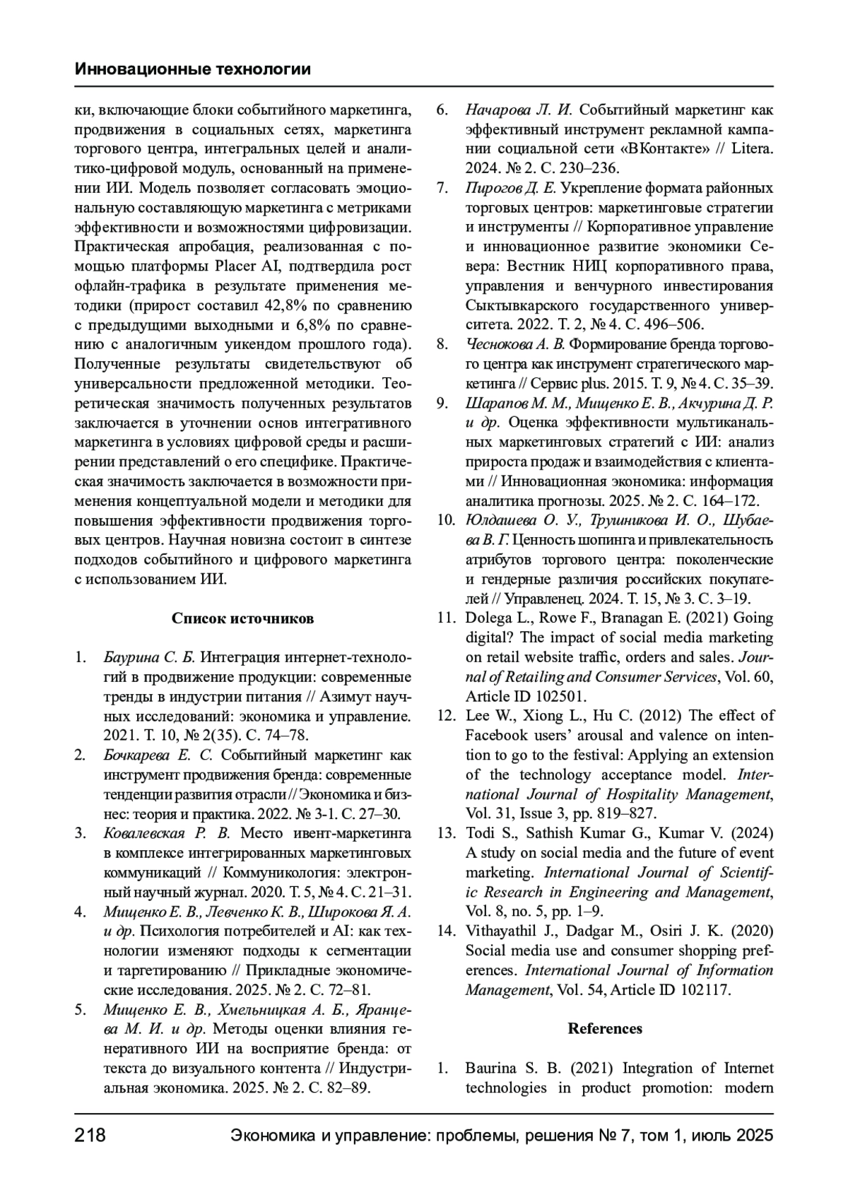 9. Шарапов М. М., Мищенко Е. В., Акчурина Д. Р. и др. Оценка эффективности мультиканальных маркетинговых стратегий с ИИ: анализ прироста продаж и взаимодействия с клиентами // Инновационная экономика: информация аналитика прогнозы. 2025. № 2. С. 164-172. EDN: ONVDXK