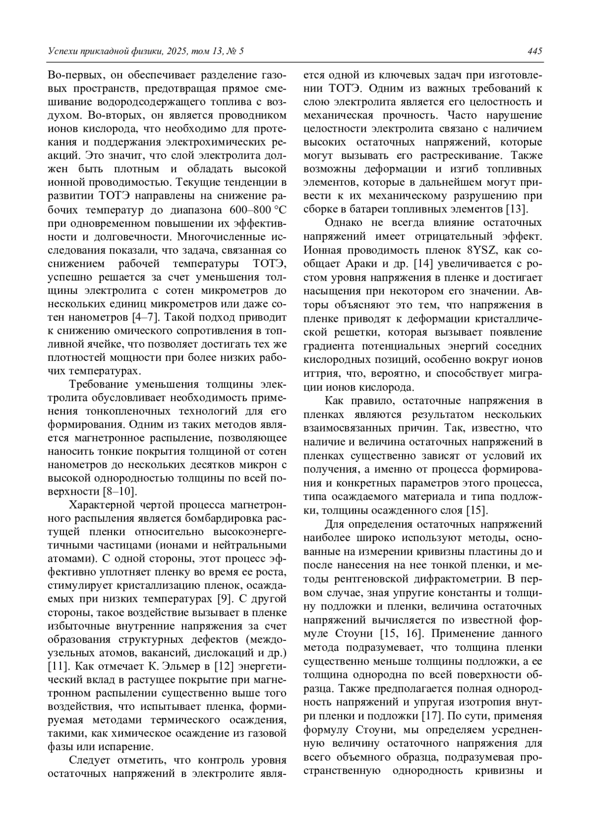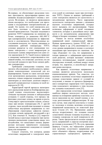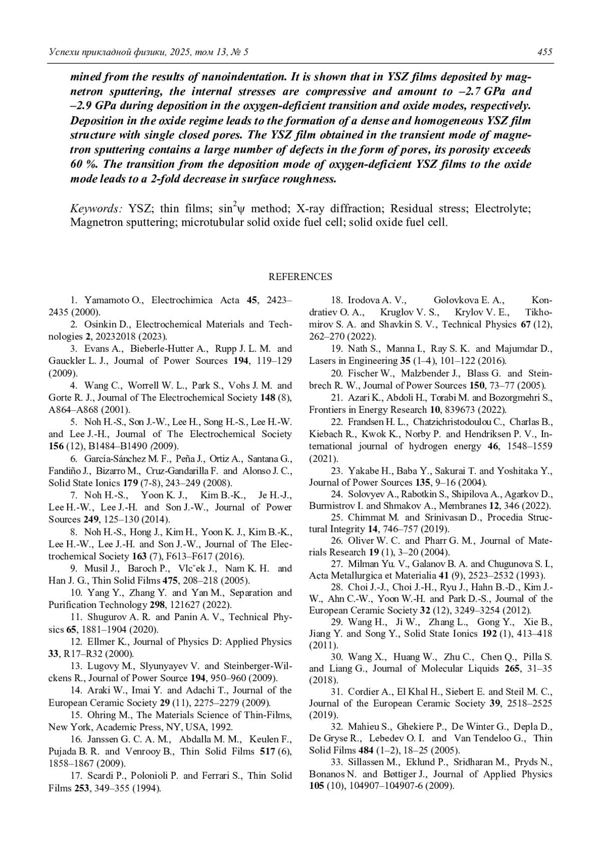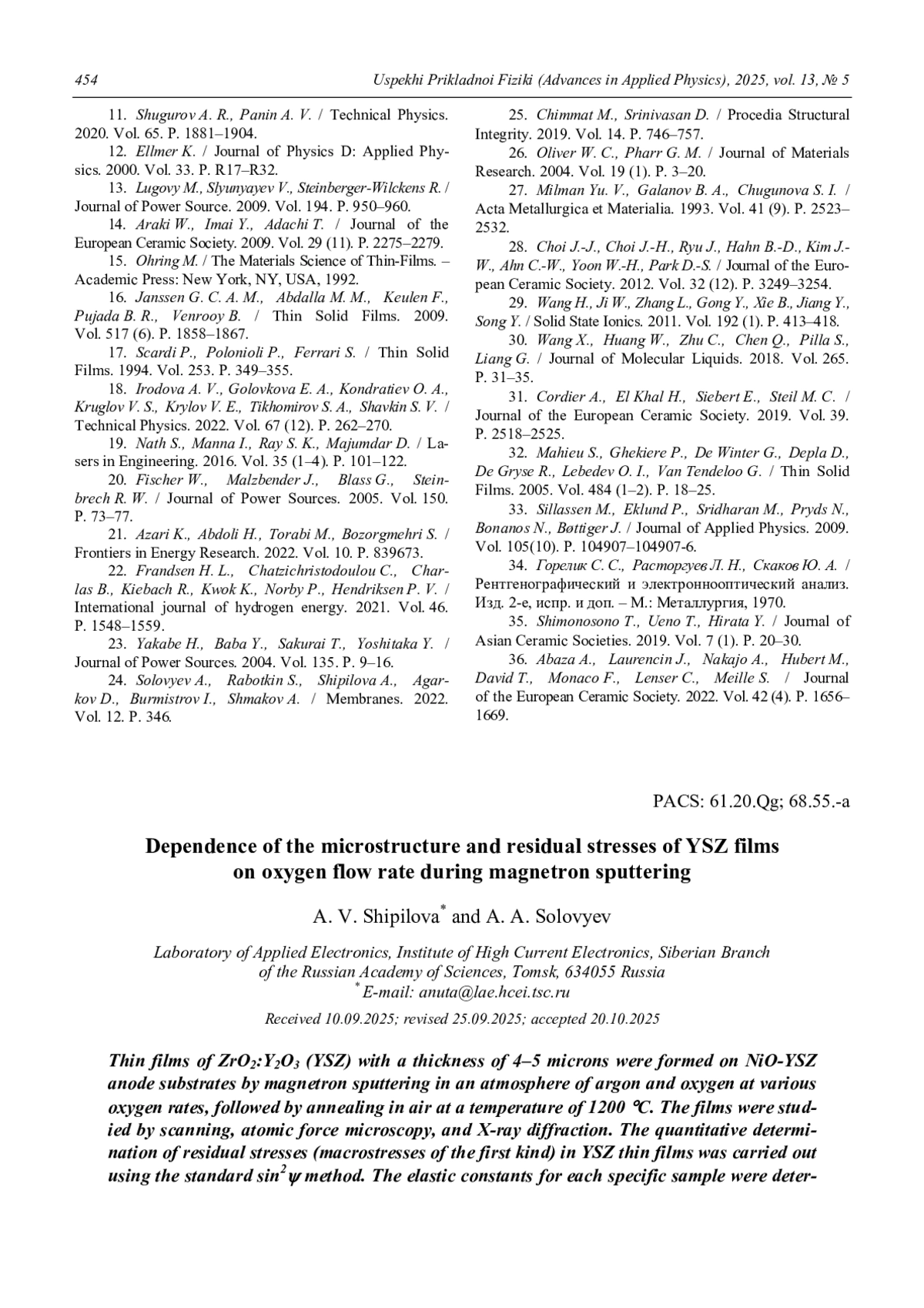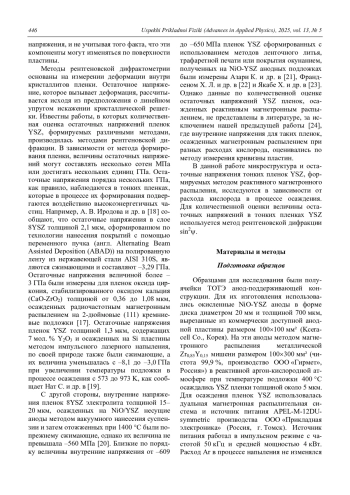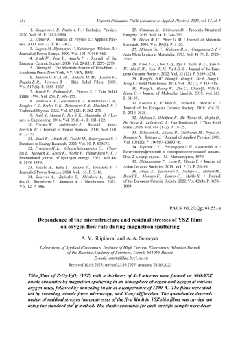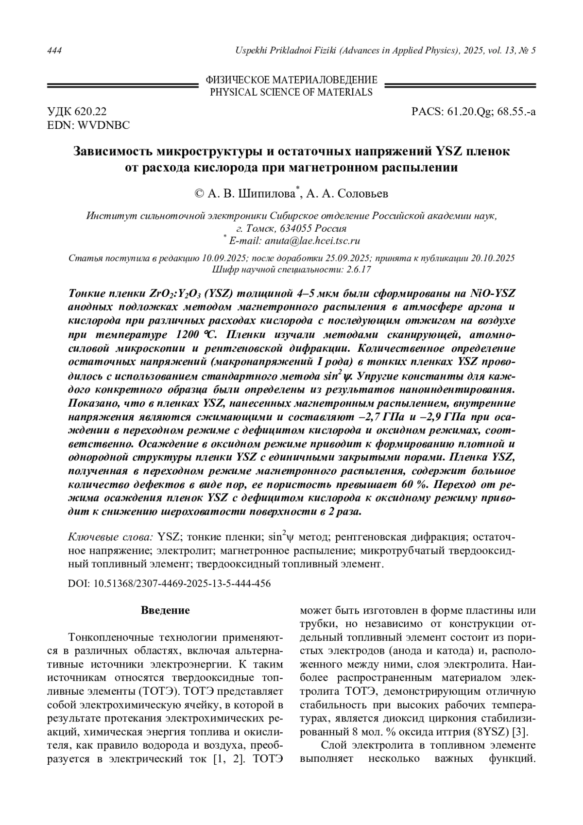 ШИПИЛОВА А. В., СОЛОВЬЕВ А. А. ЗАВИСИМОСТЬ МИКРОСТРУКТУРЫ И ОСТАТОЧНЫХ НАПРЯЖЕНИЙ YSZ ПЛЕНОК ОТ РАСХОДА КИСЛОРОДА ПРИ МАГНЕТРОННОМ РАСПЫЛЕНИИ // УСПЕХИ ПРИКЛАДНОЙ ФИЗИКИ. 2025. №5