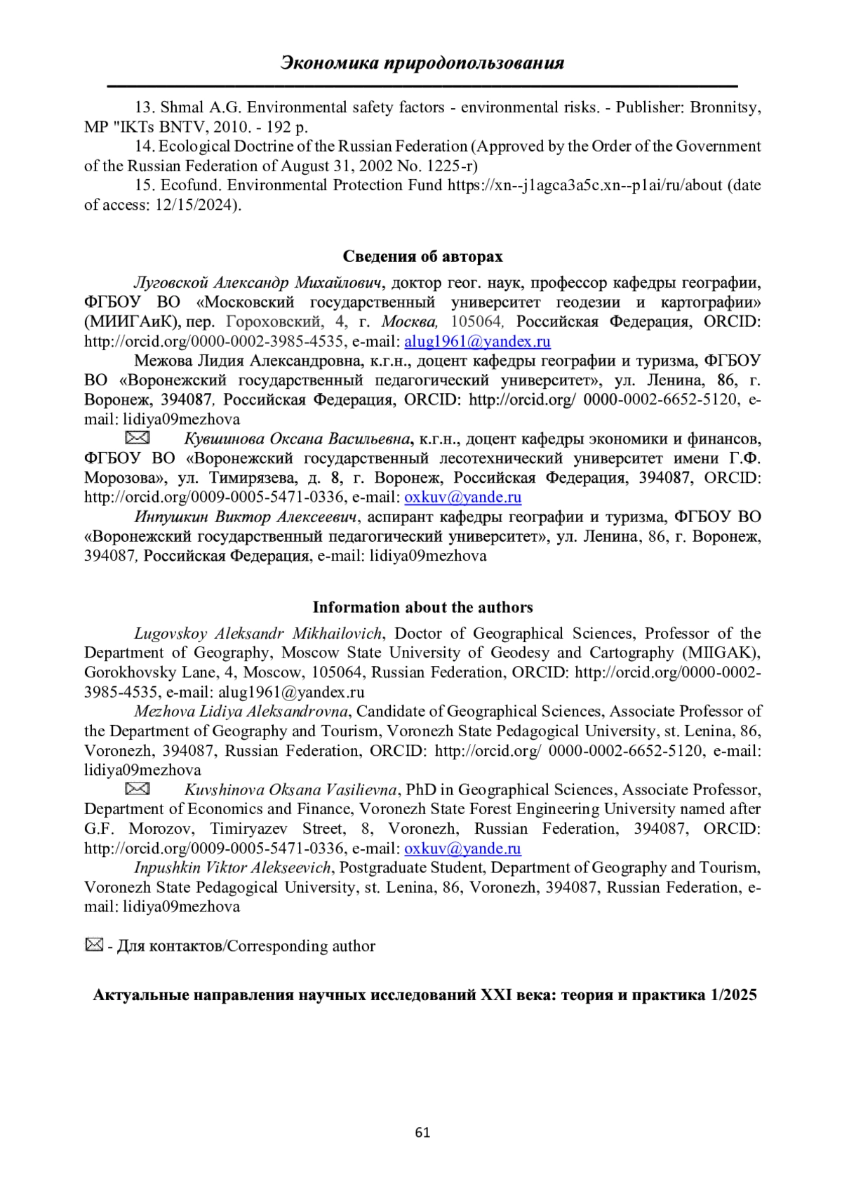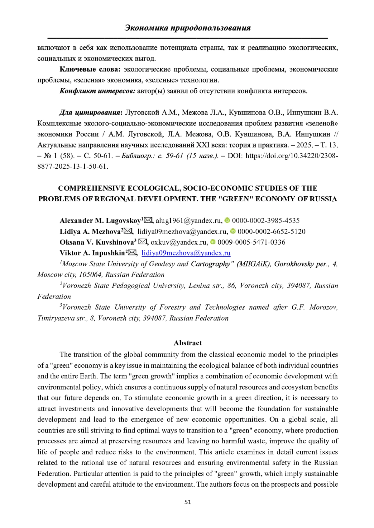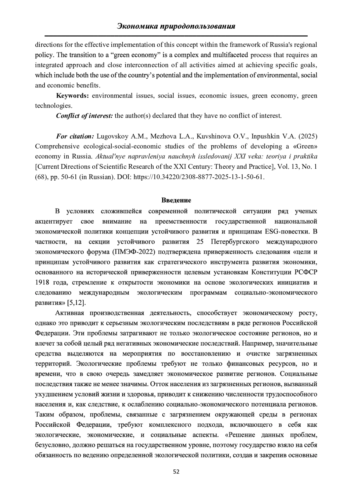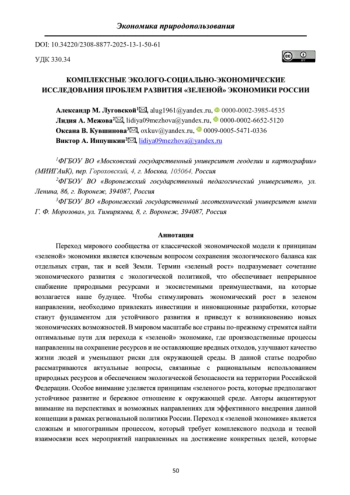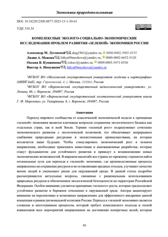ЛУГОВСКОЙ А. М., МЕЖОВА Л. А., КУВШИНОВА О. В., ИНПУШКИН В. А. КОМПЛЕКСНЫЕ ЭКОЛОГО-СОЦИАЛЬНО-ЭКОНОМИЧЕСКИЕ ИССЛЕДОВАНИЯ ПРОБЛЕМ РАЗВИТИЯ «ЗЕЛЕНОЙ» ЭКОНОМИКИ РОССИИ // АКТУАЛЬНЫЕ НАПРАВЛЕНИЯ НАУЧНЫХ ИССЛЕДОВАНИЙ XXI ВЕКА: ТЕОРИЯ И ПРАКТИКА. 2025. Т. 13 № 1 (68)