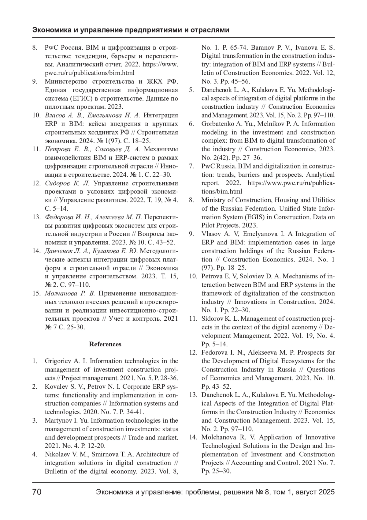 5. Баранов П. В., Иванова Е. С. Цифровая трансформация в строительной отрасли: интеграция BIM и ERP-систем // Вестник строительной экономики. 2022. Т. 12, № 3. С. 45-56.