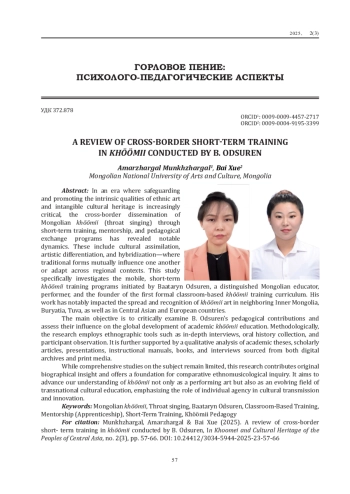 В эпоху, когда сохранение внутренних качеств этнического искусства и культуры, а также акцентирование на них стало критически важным, трансграничное распространение искусства хоомия посредством краткосрочных программ обучения и наставничества выявляет заметные тенденции. К ним относятся процессы ассимиляции, дифференциации и конвергенции практик, где одна форма влияет на другую, или же перенимает элементы другой. Данное исследование фокусировано на мобильных краткосрочных программах обучения хоомия, организованных Баатарыном Одсурэном – известным педагогом и основателем формального обучения монгольскому искусству хоомия в классах в соседних регионах и странах Евразии. Основная цель статьи состоит в исследовании вклада Б. Одсурэна в глобальное развитие обучения искусству хоомия в классах. К методологии исследования относятся такие этнографические инструменты, как интервью и устный рассказ, подкрепленный анализом сопутствующих работ, включая диссертации бакалавров, магистров и докторов наук, научные статьи, презентации, книги, руководства и интервью как из цифровых, так и из печатных СМИ. Собранные данные были проанализированы и синтезированы для проведения всестороннего анализа.