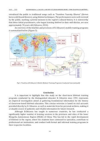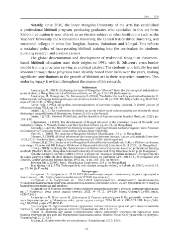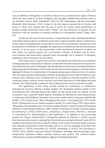The main objective is to critically examine B. Odsuren’s pedagogical contributions and assess their influence on the global development of academic khöömii education. Methodologically, the research employs ethnographic tools such as in-depth interviews, oral history collection, and participant observation. It is further supported by a qualitative analysis of academic theses, scholarly articles, presentations, instructional manuals, books, and interviews sourced from both digital archives and print media.