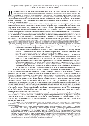 В статье рассматривается историческая трансформация стержневого вопроса христианской теологии — христологической проблемы — в свете решений Двинских соборов (начало VI — начало VIII вв.) Армянской апостольской святой церкви. Христологическая проблема, активно обсуждавшаяся в армянской церковной среде уже со второй половины V в., вследствие комплекса причин и преимущественно геополитического и геостратегического положения Армении, на протяжении многих веков стала точкой «догматического размежевания» между Армянской и вселенской церквями. Участие Армянской церкви (прямое или косвенное) в многовековой богословской полемике объясняется её стремлением сохранить свою самостоятельность и национальную специфику. Статья изложена на основе изучения первоисточников и в свете авторской методологической концепции исследования истории армянской духовной культуры. Стержневыми в статье являются четыре взаимосвязанные идеи: 1. Армянская церковь, как самая древняя национальная церковь, с самого своего возникновения была той институцией, которая создавала, сохраняла, развивала и транслировала во времени армянскую национальную духовную культуру, тем самым обеспечивая культурную преемственность армянского народа; 2. На протяжении многовековой истории своего существования Армянская церковь играла роль национального духовного центра, где создавались, сохранялись и развивались армянские национальные духовные и культурные традиции — предусловие обеспечения культурной самобытности армянской нации. Бином церкви и нации, религии и национальной культуры стал основой её самопознания/самосознания, а через это — механизмом выживания и самозащиты нации в течение всей истории её существования как нации христианской; 3. Более двухсот лет Двинские соборы Армянской церкви выступали в качестве важнейшего инструмента обоснования и закрепления (в разных исторических, политических и идеологических контекстах) доктринальной позиции Армянской церкви, защиты её вероисповедания от разного рода отклонений; 4. Сохраняя заложенные отцами Армянской церкви традиции, главы Армянской церкви принимали на созываемых ими Двинских соборах такие решения, которые обеспечивали самостоятельность Армянской церкви, что в рамках моей методологической концепции я называю способом обоснования («оправдания») возможности и необходимости исторического существования армянской нации.