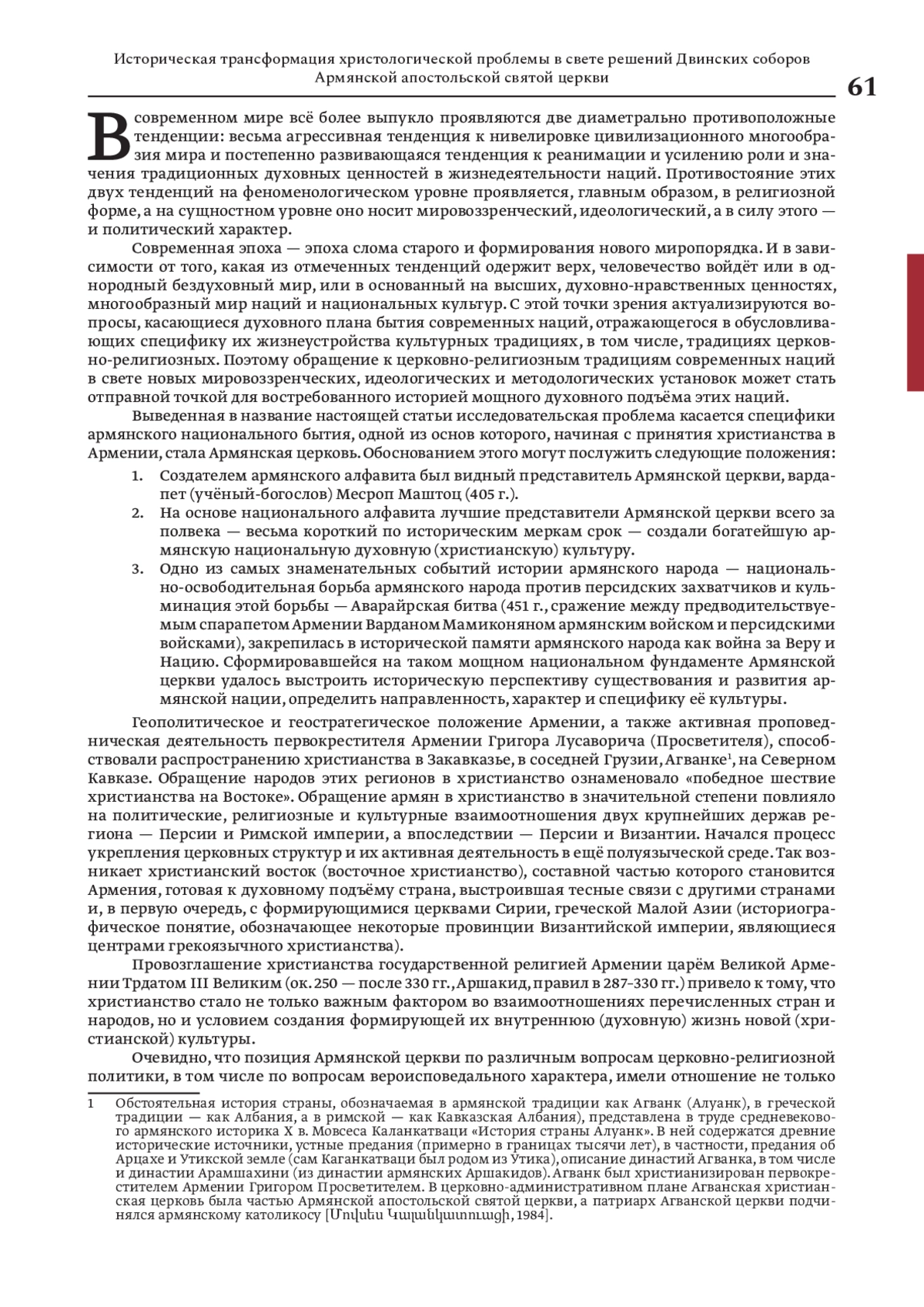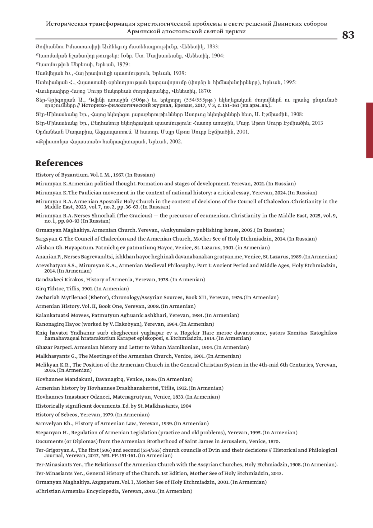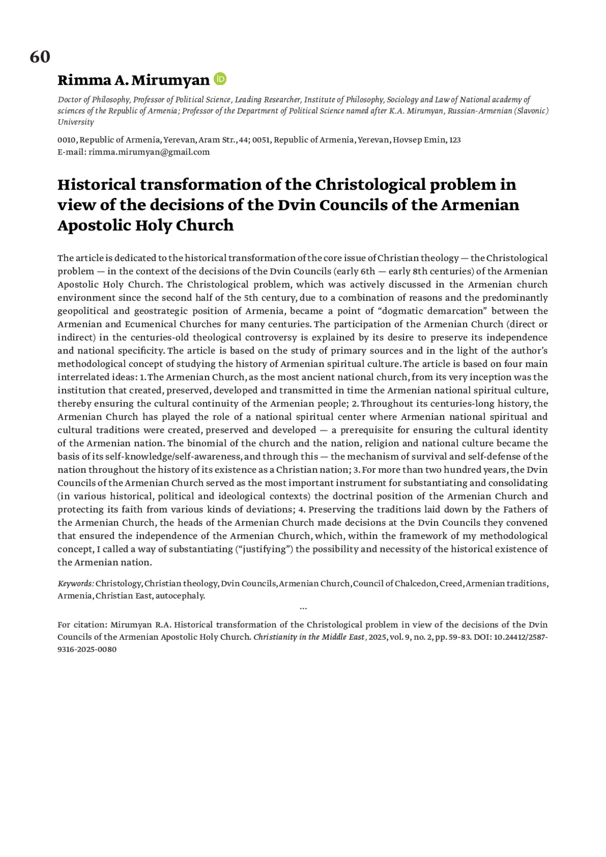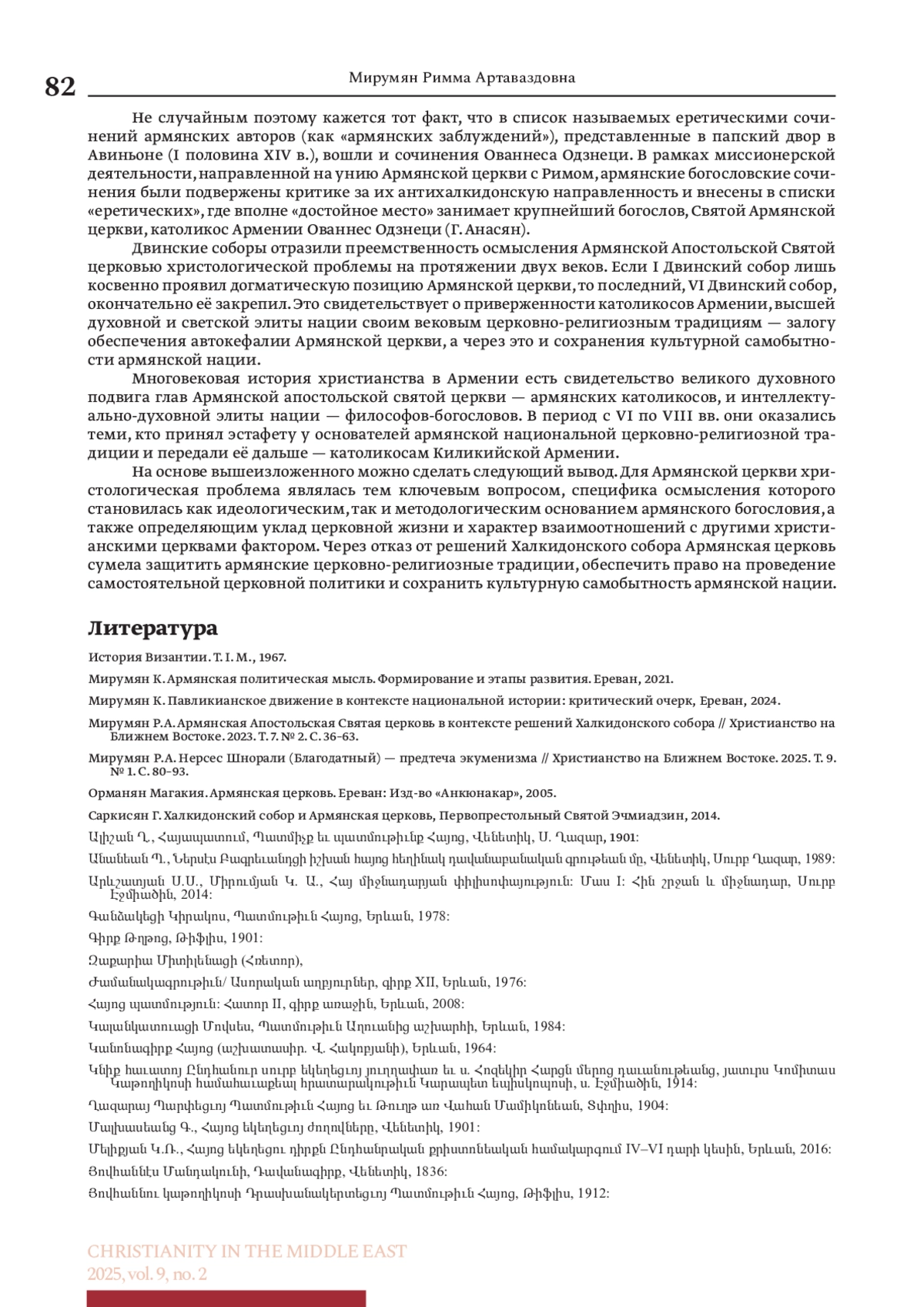 МИРУМЯН Р. А. ИСТОРИЧЕСКАЯ ТРАНСФОРМАЦИЯ ХРИСТОЛОГИЧЕСКОЙ ПРОБЛЕМЫ В СВЕТЕ РЕШЕНИЙ ДВИНСКИХ СОБОРОВ АРМЯНСКОЙ АПОСТОЛЬСКОЙ СВЯТОЙ ЦЕРКВИ // ХРИСТИАНСТВО НА БЛИЖНЕМ ВОСТОКЕ. 2025. № 2, ТОМ 9