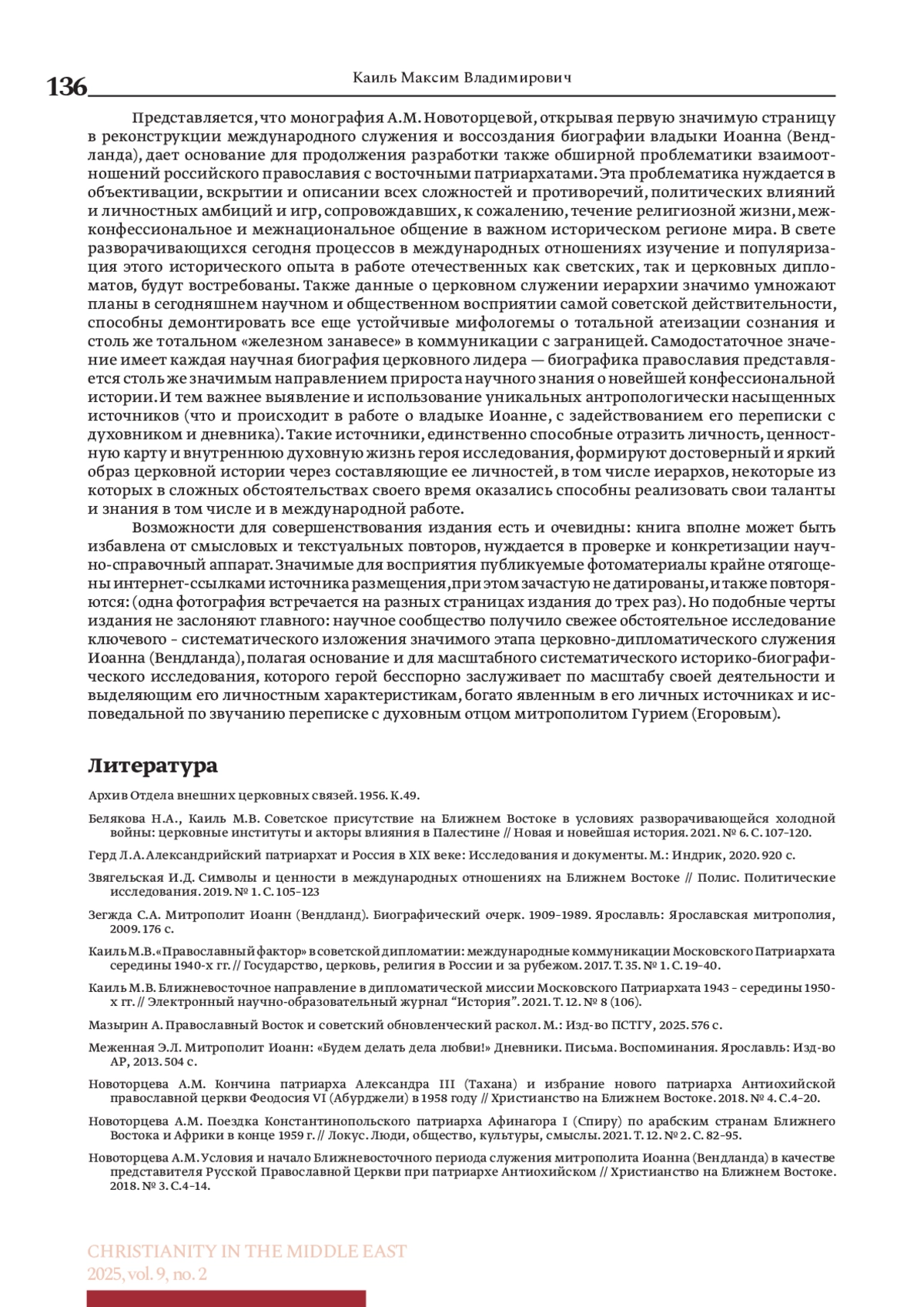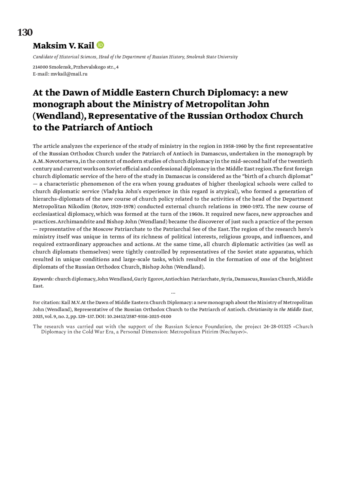 В статье в контексте современных исследований церковной дипломатии середины — второй половины ХХ в. и актуальных работ, посвященных советской официальной и конфессиональной дипломатии в ближневосточном регионе, анализируется опыт исследования служения в 1958–1960 гг. первого представителя Русской православной церкви при патриархе антиохийском в Дамаске, предпринятый в монографии А. М. Новоторцевой. Первое заграничное церковно-дипломатическое служение героя исследования в Дамаске рассматривается как «рождение церковного дипломата» — характерное явление эпохи, когда к церковно-дипломатическому служению были призваны молодые (опыт владыки Иоанна в этом плане нетипичный) выпускники советских высших духовных школ, сформировавшие поколение иерархов-дипломатов нового курса церковной политики, связанной с деятельностью главы отдела внешних церковных сношений в 1960–1972 гг. митрополита Никодима (Ротова, 1929-1978). Новый курс церковной дипломатии, формирующийся на рубеже 1960-х гг. требовал новых лиц, новых подходов и практик. Открывателем именно такой институционализации церковной дипломатии — персоны — представителя Московского патриархата при патриаршем престоле востока и стал архимандрит, а вскоре епископ Иоанн (Вендланд). Сам регион служения героя исследования — уникальный по насыщенности политических интересов, религиозных групп и влияний, требовал неординарных подходов и поступков. Вместе с тем, вся церковно-дипломатическая деятельность (как и сами церковные дипломаты) жестко контролировались представителями советского государственного аппарата, результатом чего были уникальные по сложности условия и масштабные задачи деятельности, в решении которых сформировался один из плеяды ярких дипломатов Русской православной церкви — епископ Иоанн (Вендланд).