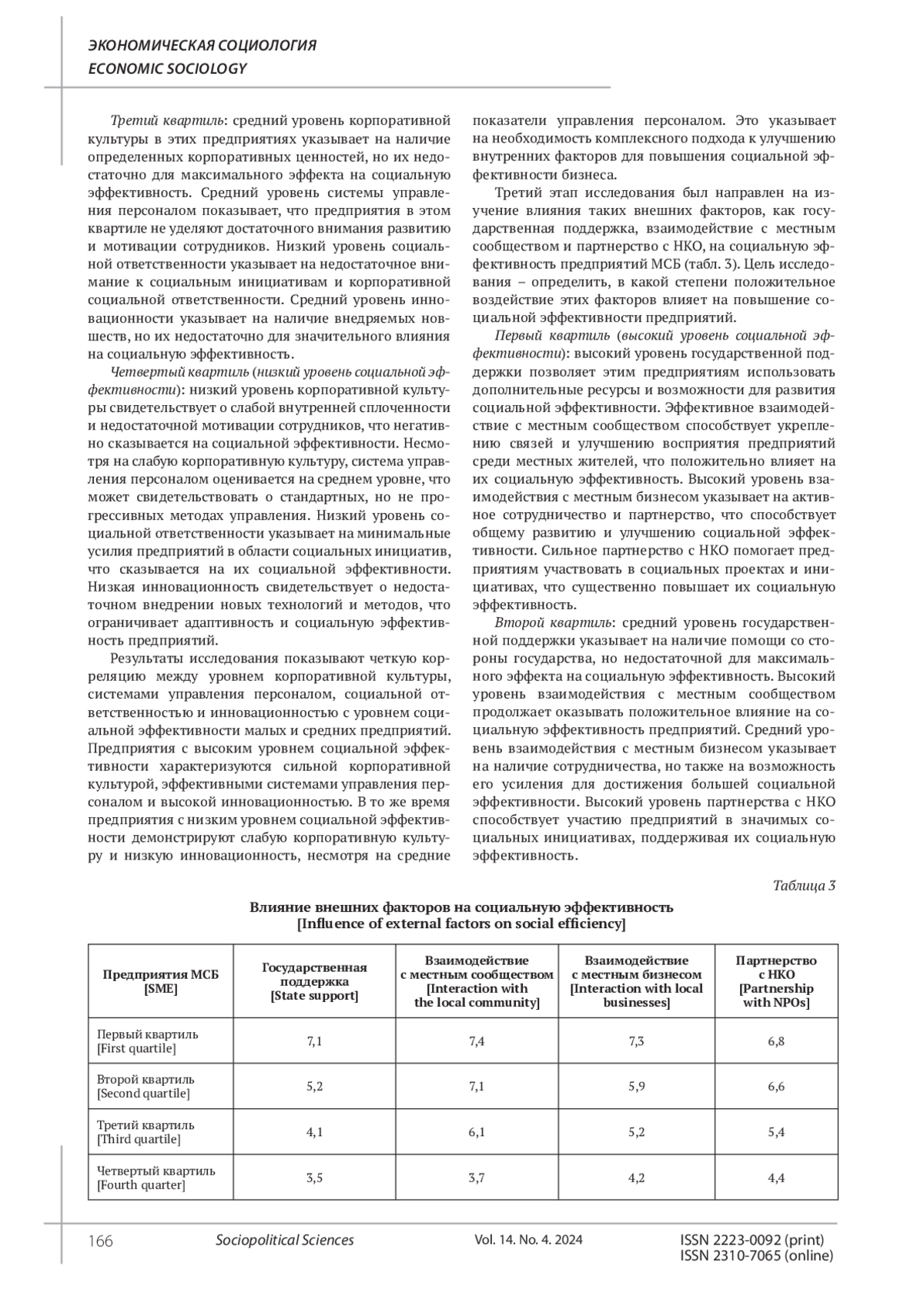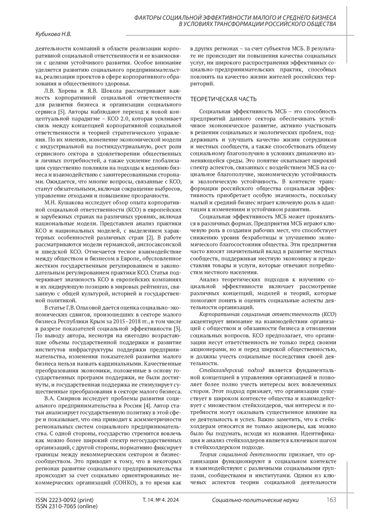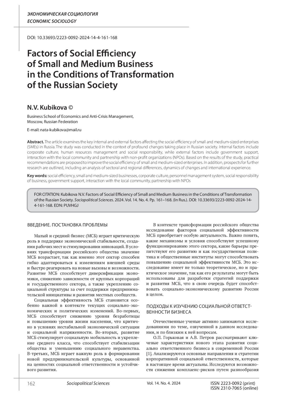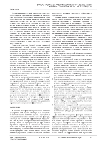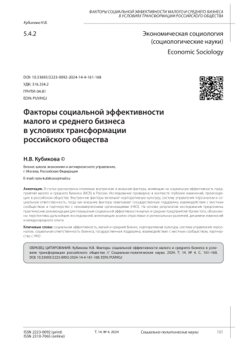 КУБИКОВА Н. В. ФАКТОРЫ СОЦИАЛЬНОЙ ЭФФЕКТИВНОСТИ МАЛОГО И СРЕДНЕГО БИЗНЕСА В УСЛОВИЯХ ТРАНСФОРМАЦИИ РОССИЙСКОГО ОБЩЕСТВА // СОЦИАЛЬНО-ПОЛИТИЧЕСКИЕ НАУКИ. 2024. Т. 14 № 4