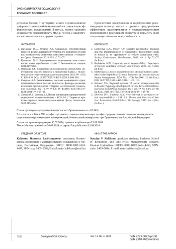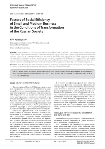Статья: ФАКТОРЫ СОЦИАЛЬНОЙ ЭФФЕКТИВНОСТИ МАЛОГО И СРЕДНЕГО БИЗНЕСА В УСЛОВИЯХ ТРАНСФОРМАЦИИ РОССИЙСКОГО ОБЩЕСТВА (2024)