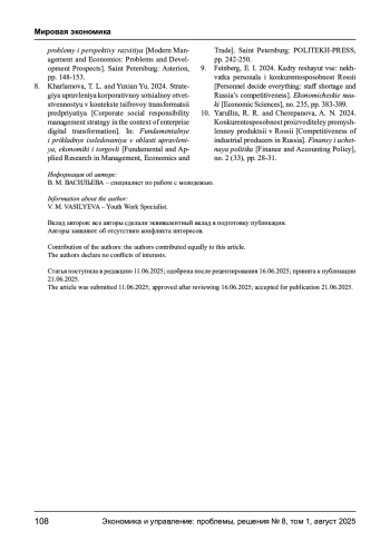 8. Харламова Т. Л., Юйсянь Ю. Стратегия управления корпоративной социальной ответственностью в контексте цифровой трансформации предприятия // Фундаментальные и прикладные исследования в области управления, экономики и торговли: сб. тр. Всерос. науч.-практ. и учеб.-метод. конф., Санкт-Петербург, 15-18 мая 2024 г. Ч. 2. СПб.: ПОЛИТЕХ-ПРЕСС, 2024. С. 242-250. EDN: EMFLMC