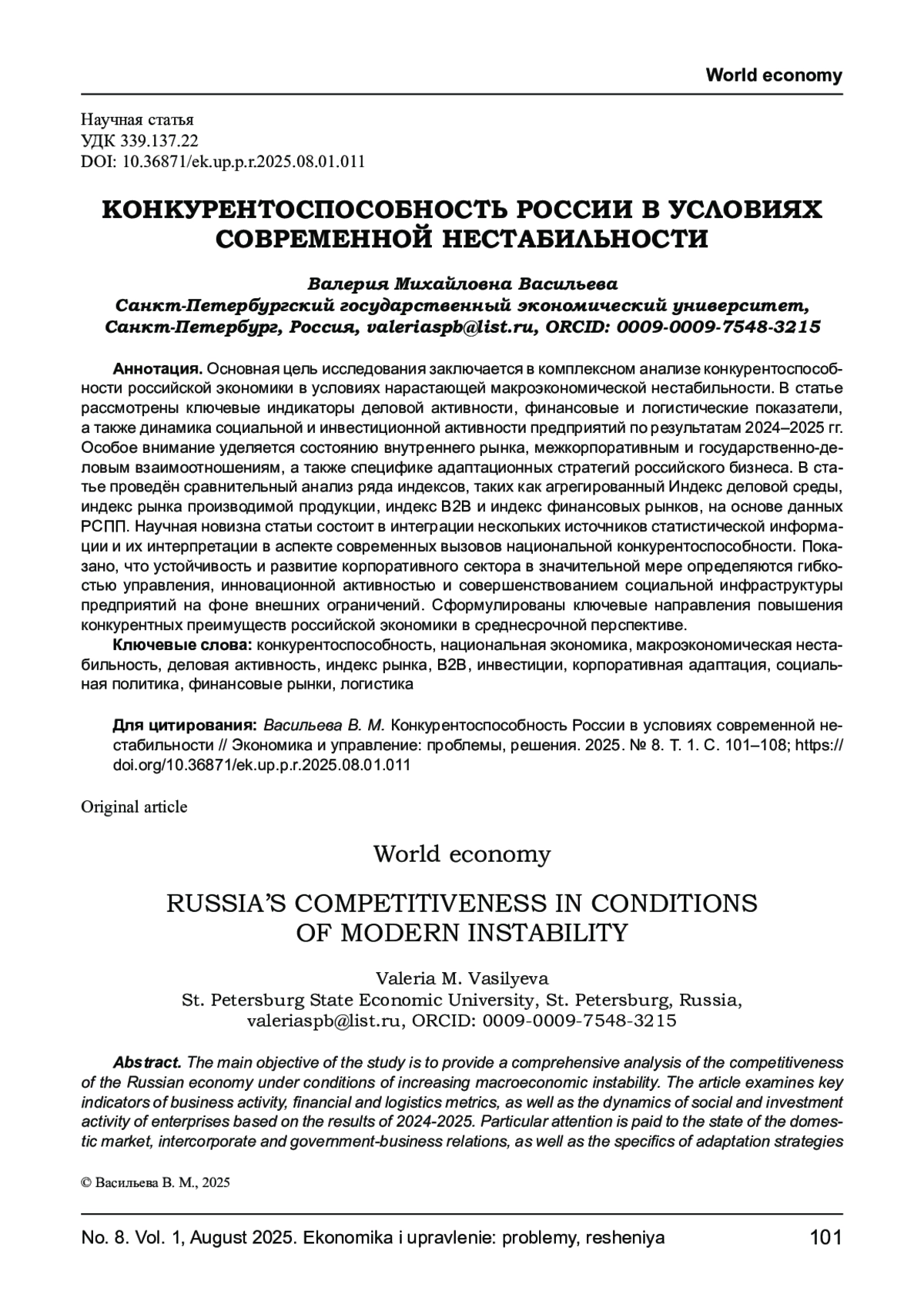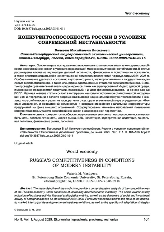Основная цель исследования заключается в комплексном анализе конкурентоспособности российской экономики в условиях нарастающей макроэкономической нестабильности. В статье рассмотрены ключевые индикаторы деловой активности, финансовые и логистические показатели, а также динамика социальной и инвестиционной активности предприятий по результатам 2024-2025 гг. Особое внимание уделяется состоянию внутреннего рынка, межкорпоративным и государственно-деловым взаимоотношениям, а также специфике адаптационных стратегий российского бизнеса. В статье проведён сравнительный анализ ряда индексов, таких как агрегированный Индекс деловой среды, индекс рынка производимой продукции, индекс B2B и индекс финансовых рынков, на основе данных РСПП. Научная новизна статьи состоит в интеграции нескольких источников статистической информации и их интерпретации в аспекте современных вызовов национальной конкурентоспособности. Показано, что устойчивость и развитие корпоративного сектора в значительной мере определяются гибкостью управления, инновационной активностью и совершенствованием социальной инфраструктуры предприятий на фоне внешних ограничений. Сформулированы ключевые направления повышения конкурентных преимуществ российской экономики в среднесрочной перспективе.