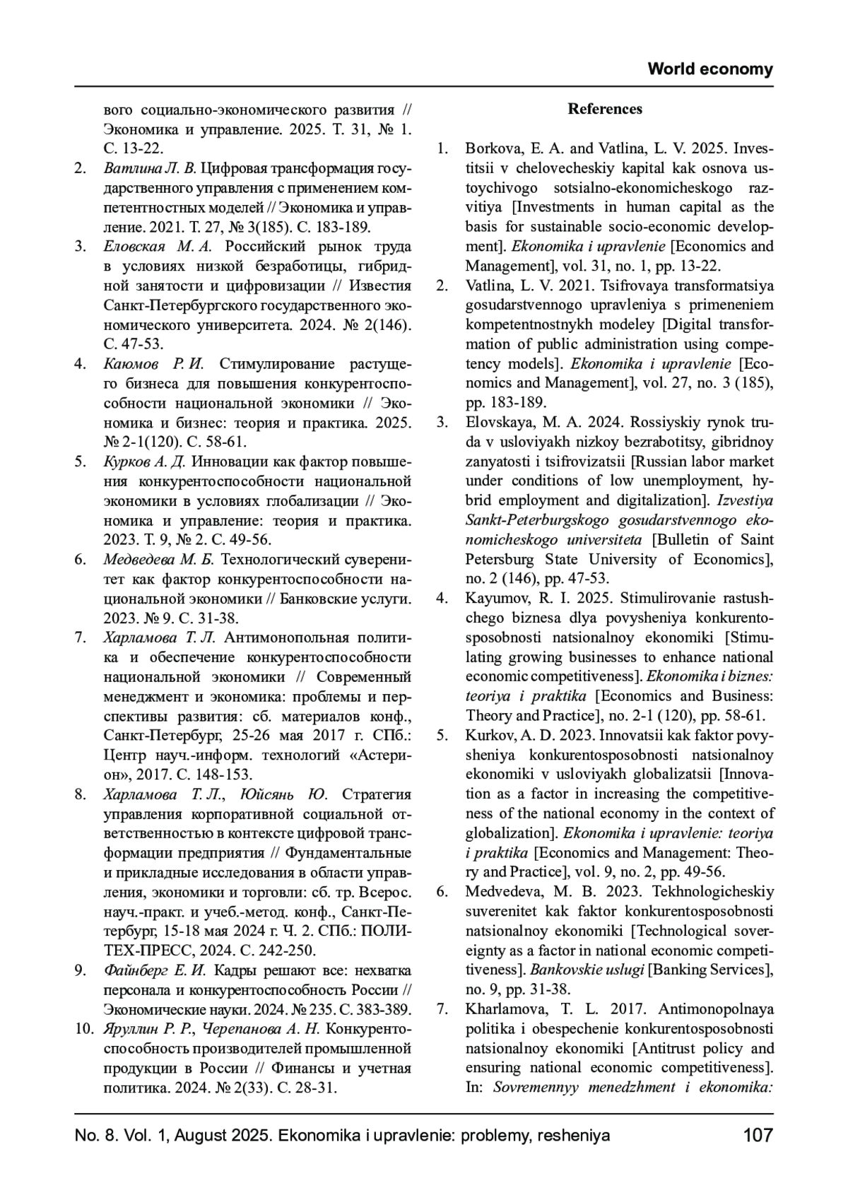 1. Боркова Е. А., Ватлина Л. В. Инвестиции в человеческий капитал как основа устойчивого социально-экономического развития // Экономика и управление. 2025. Т. 31, № 1. С. 13-22. EDN: RQHLSS