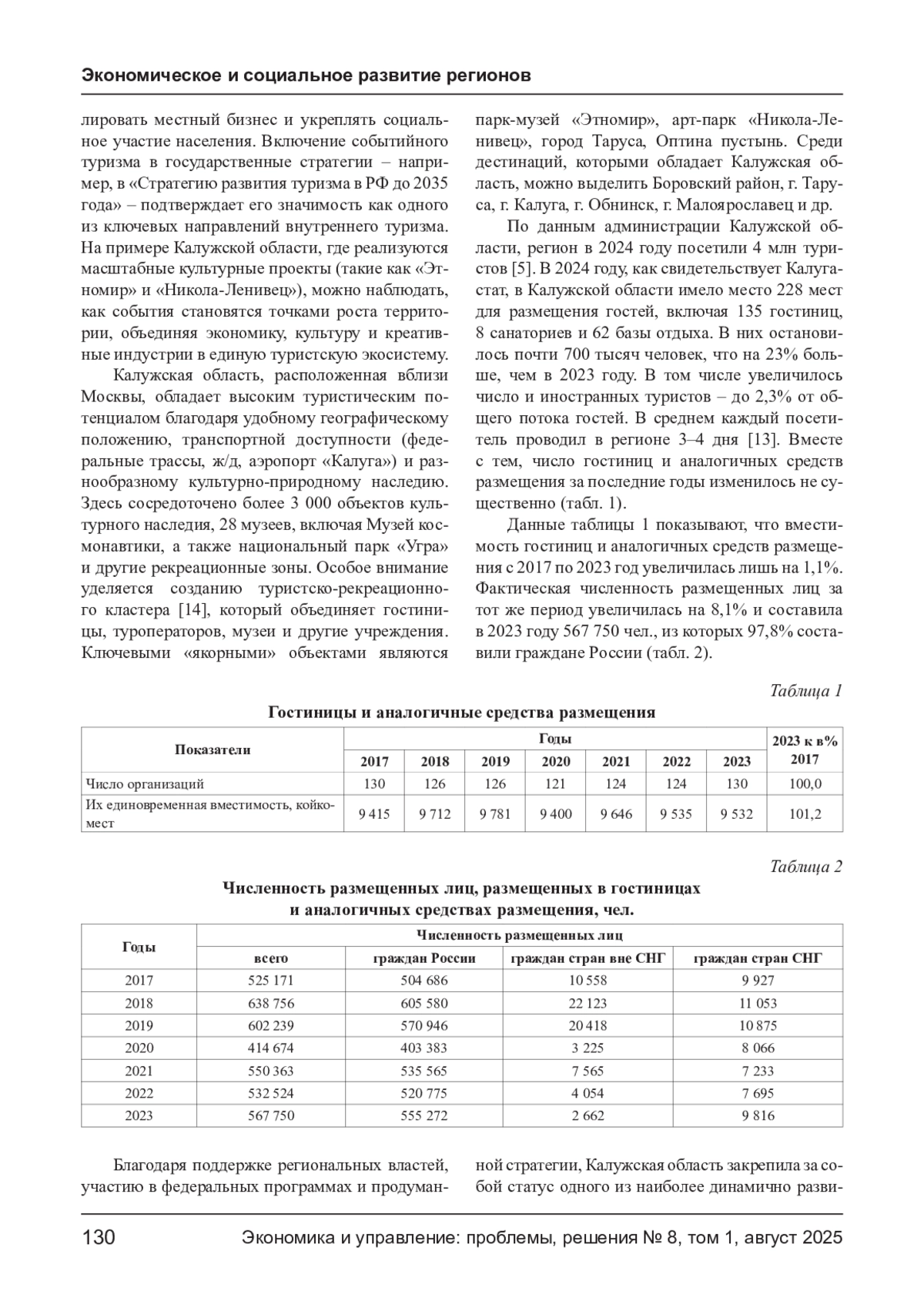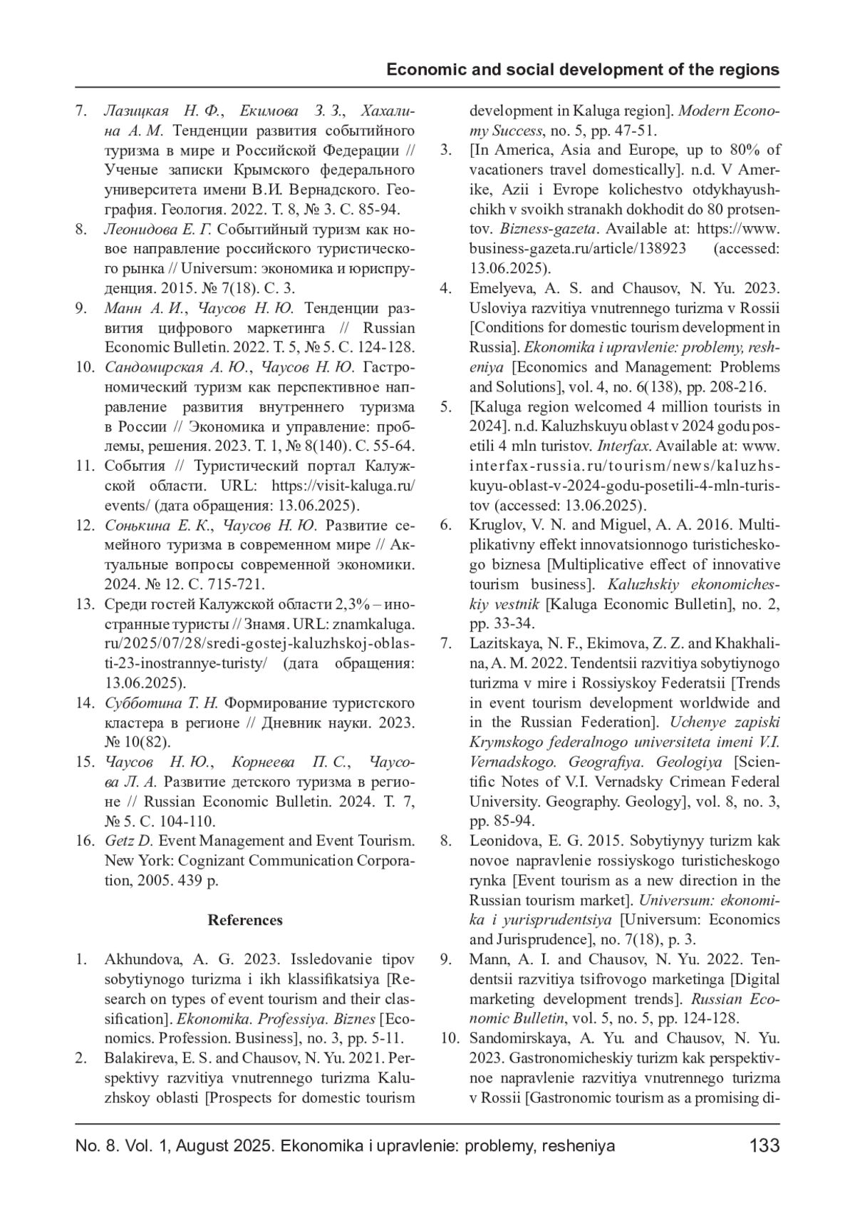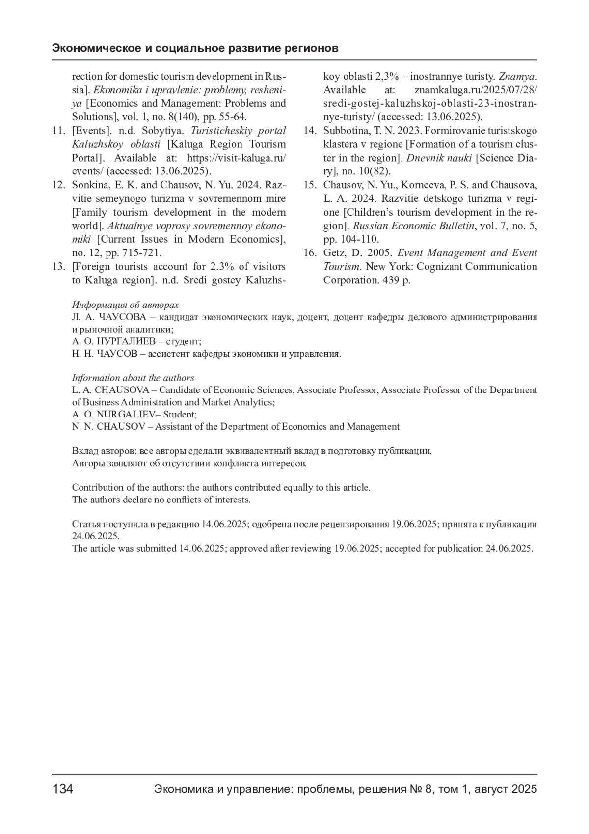 ЧАУСОВА Л. А., НУРГАЛИЕВ А. О., ЧАУСОВ Н. Н. РАЗВИТИЕ СОБЫТИЙНОГО ТУРИЗМА В КАЛУЖСКОЙ ОБЛАСТИ // ЭКОНОМИКА И УПРАВЛЕНИЕ: ПРОБЛЕМЫ, РЕШЕНИЯ. 2025. ТОМ 1 № 8