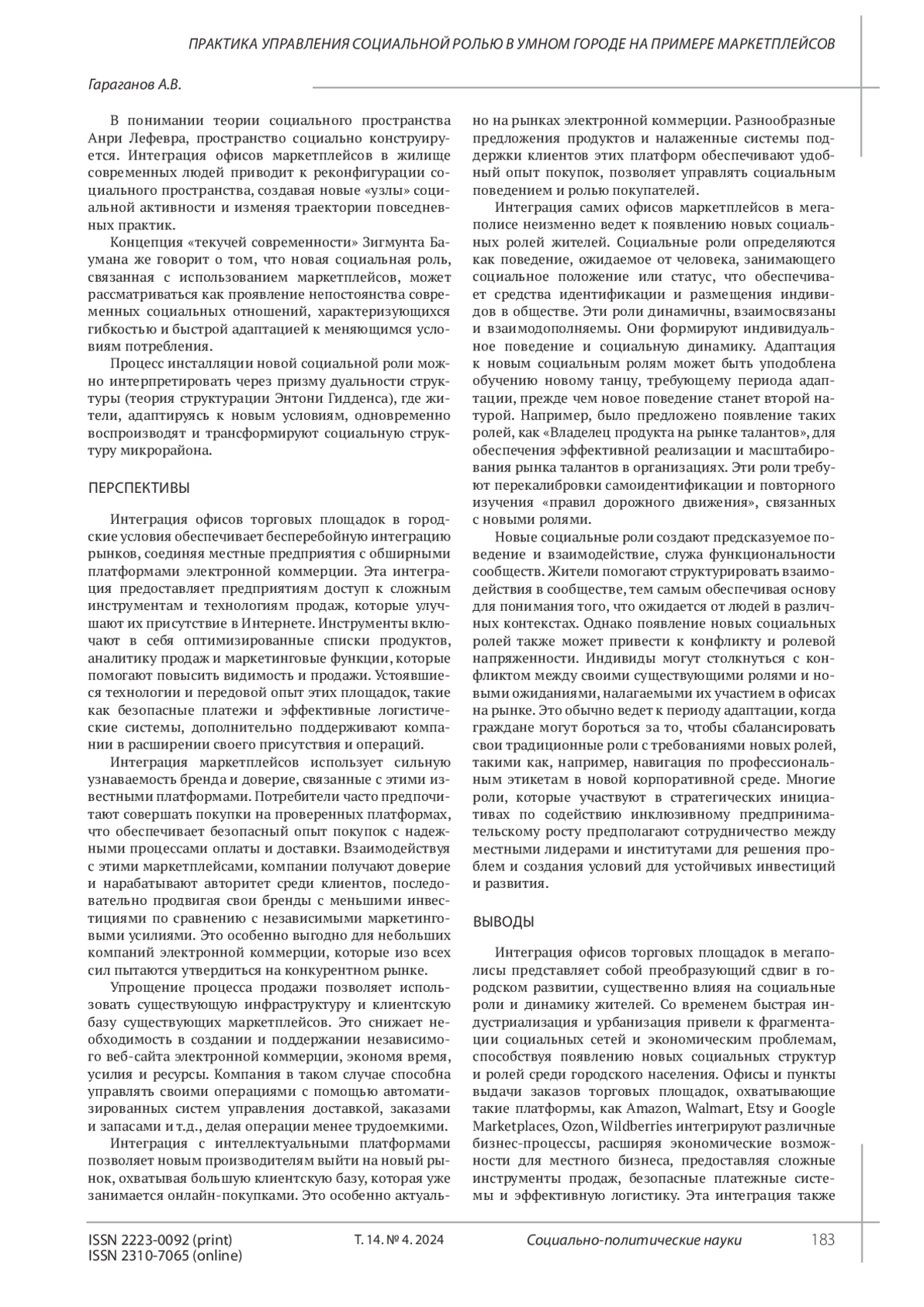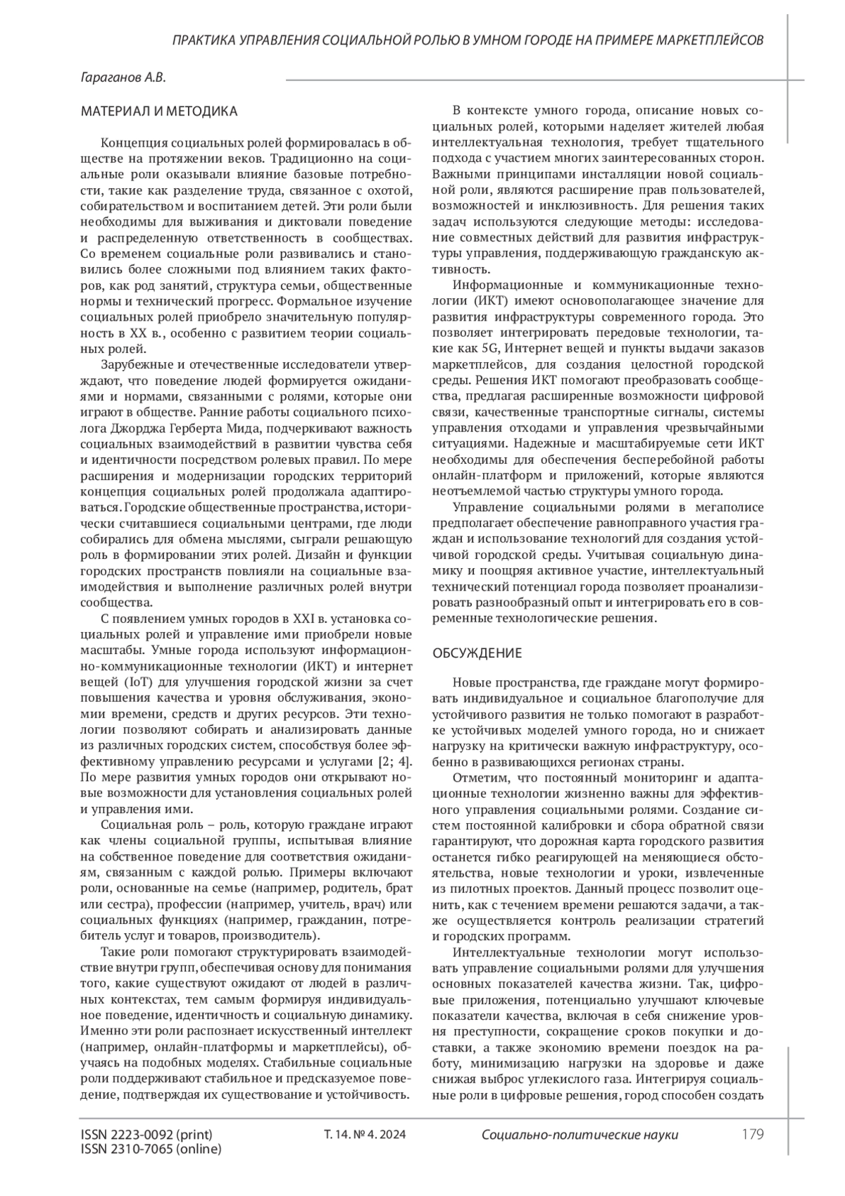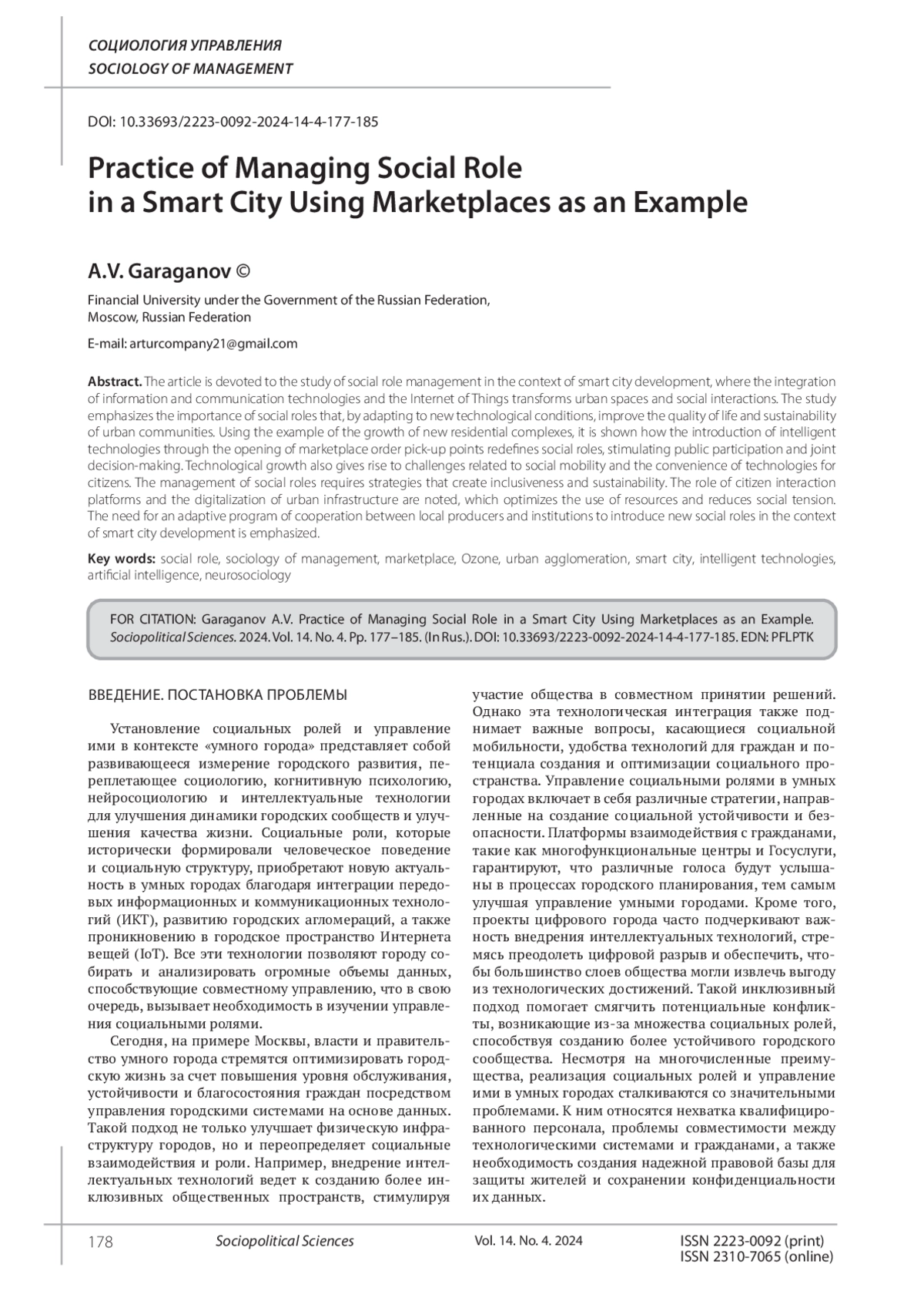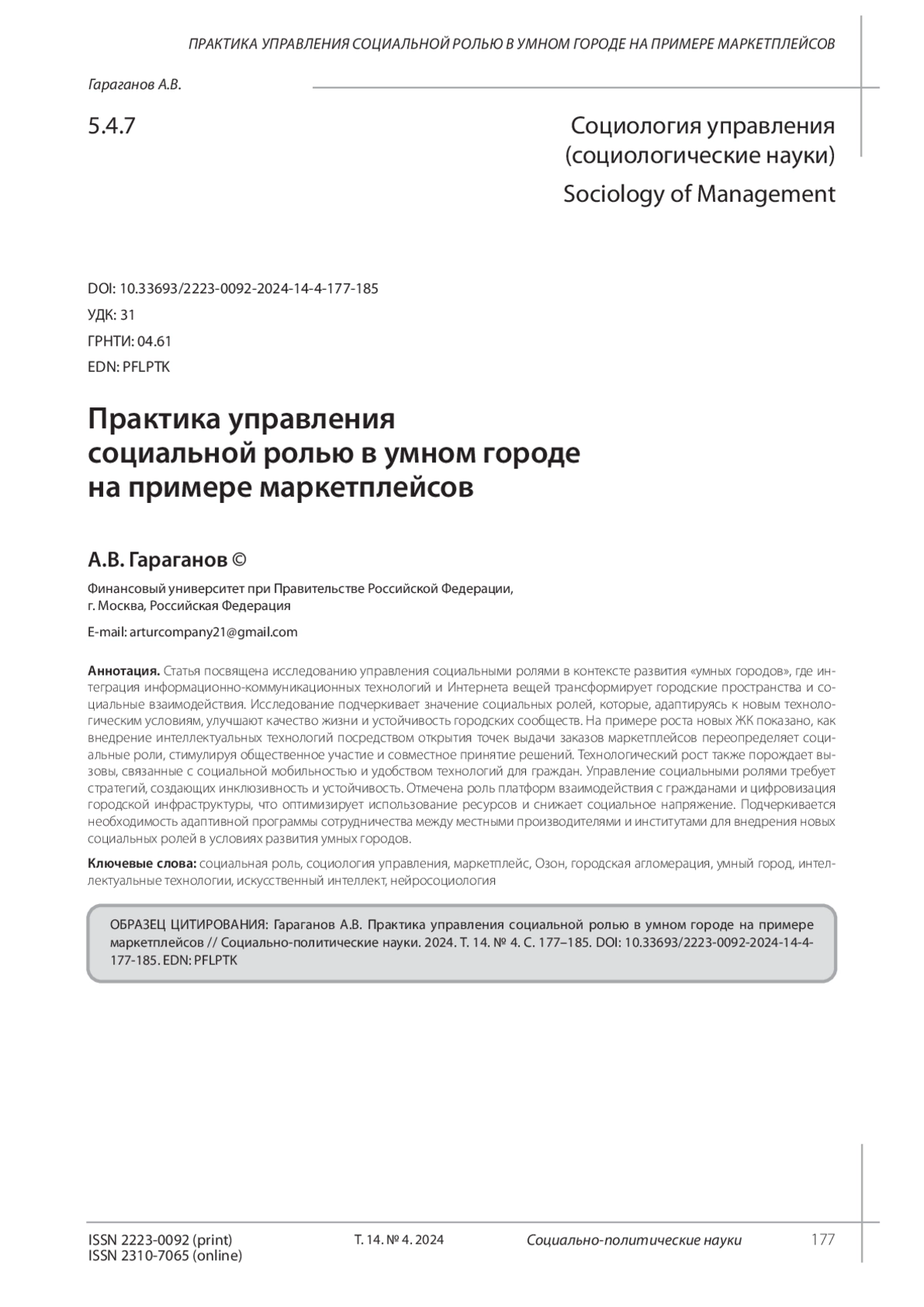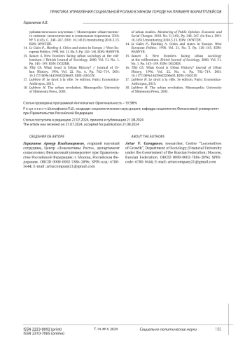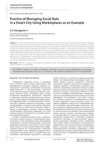 ГАРАГАНОВ А. В. ПРАКТИКА УПРАВЛЕНИЯ СОЦИАЛЬНОЙ РОЛЬЮ В УМНОМ ГОРОДЕ НА ПРИМЕРЕ МАРКЕТПЛЕЙСОВ // СОЦИАЛЬНО-ПОЛИТИЧЕСКИЕ НАУКИ. 2024. Т. 14 № 4