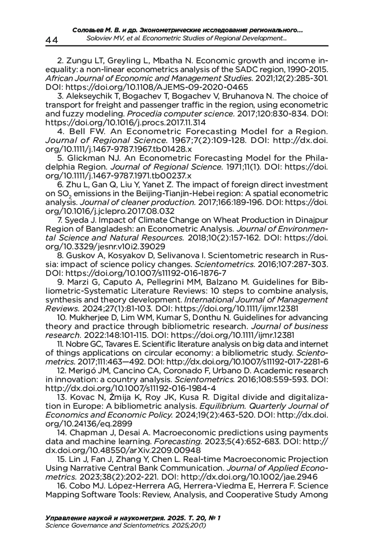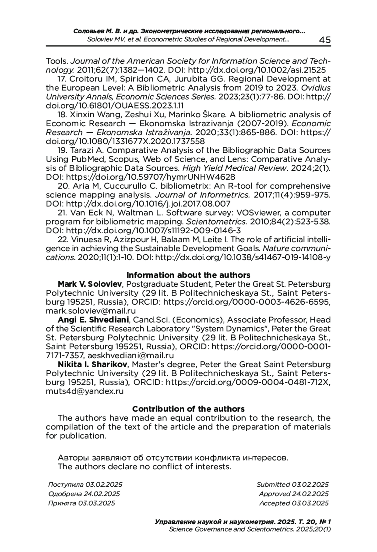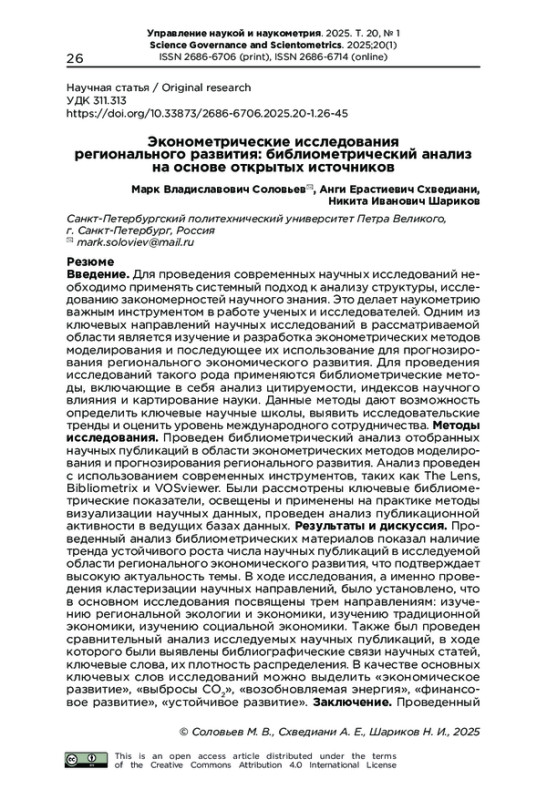 СОЛОВЬЁВ М. В., СХВЕДИАНИ А. Е., ШАРИКОВ Н. И. ЭКОНОМЕТРИЧЕСКИЕ ИССЛЕДОВАНИЯ РЕГИОНАЛЬНОГО РАЗВИТИЯ: БИБЛИОМЕТРИЧЕСКИЙ АНАЛИЗ НА ОСНОВЕ ОТКРЫТЫХ ИСТОЧНИКОВ // УПРАВЛЕНИЕ НАУКОЙ И НАУКОМЕТРИЯ. 2025. Т. 20 № 1