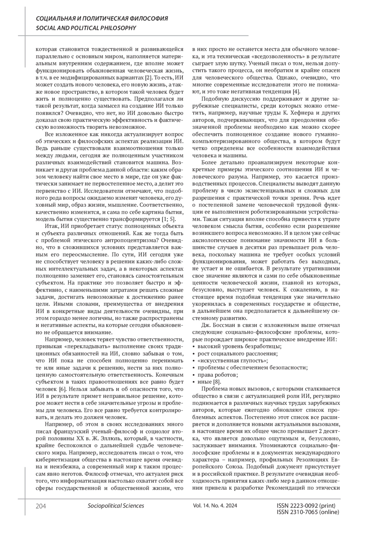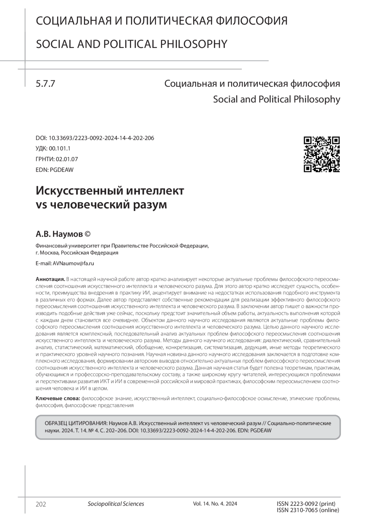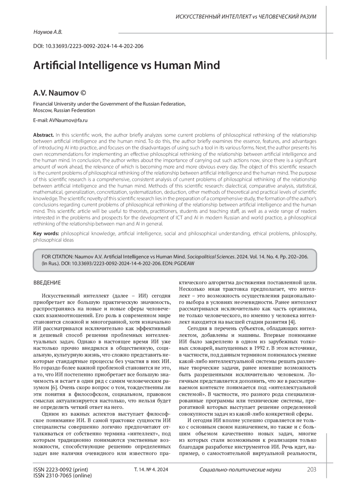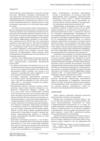 НАУМОВ А. В. ИСКУССТВЕННЫЙ ИНТЕЛЛЕКТ VS ЧЕЛОВЕЧЕСКИЙ РАЗУМ // СОЦИАЛЬНО-ПОЛИТИЧЕСКИЕ НАУКИ. 2024. Т. 14 № 4