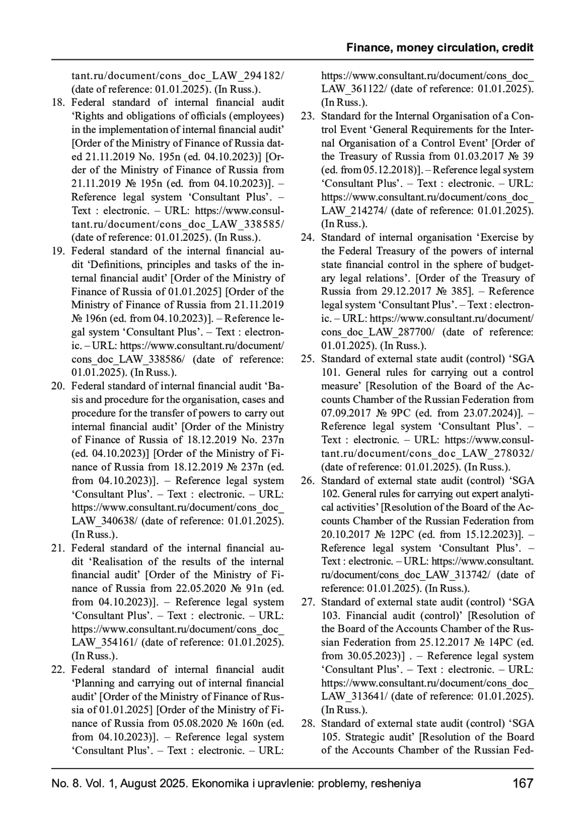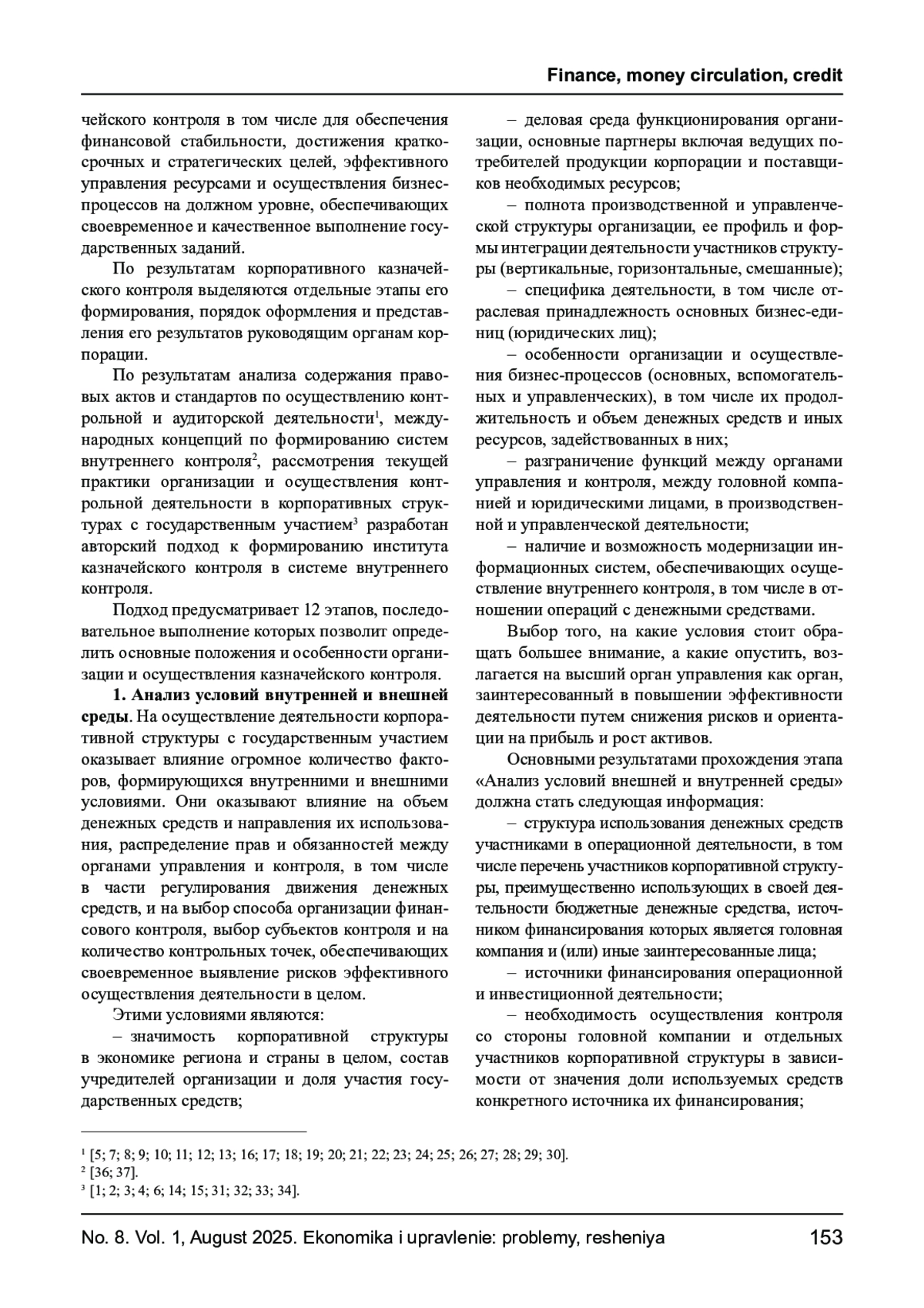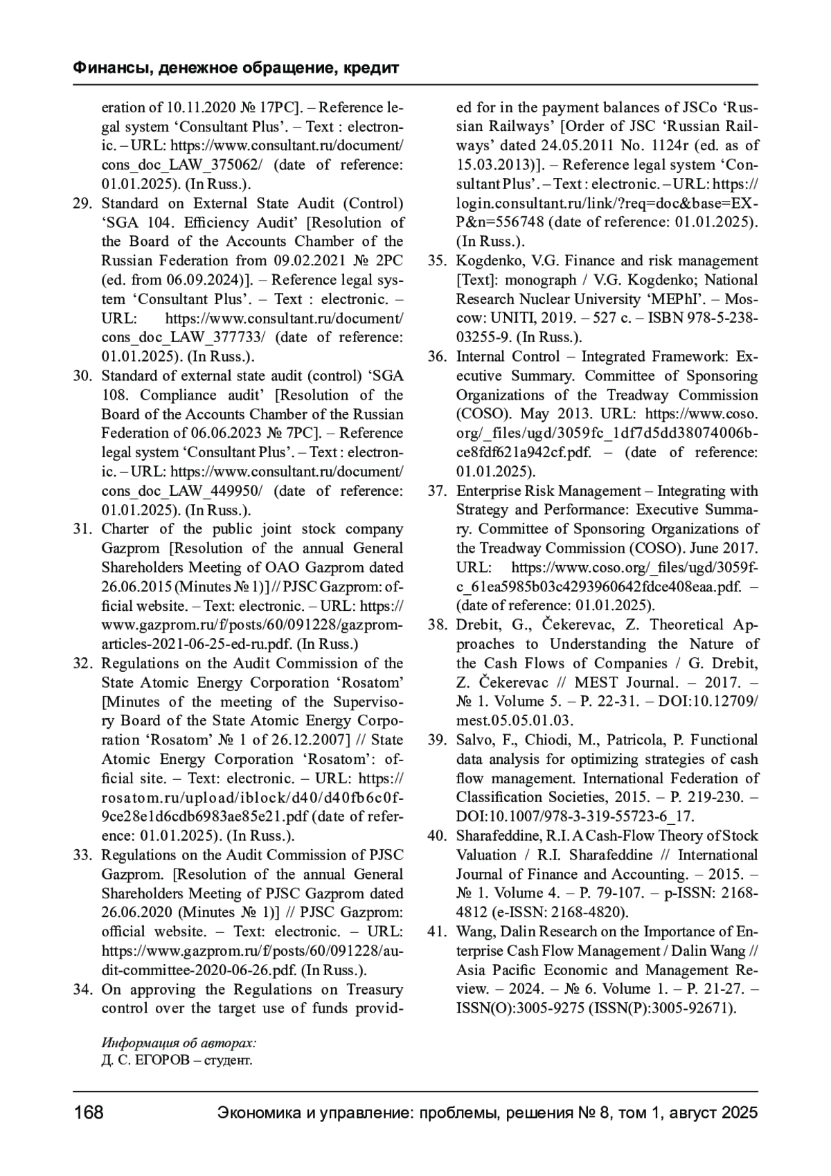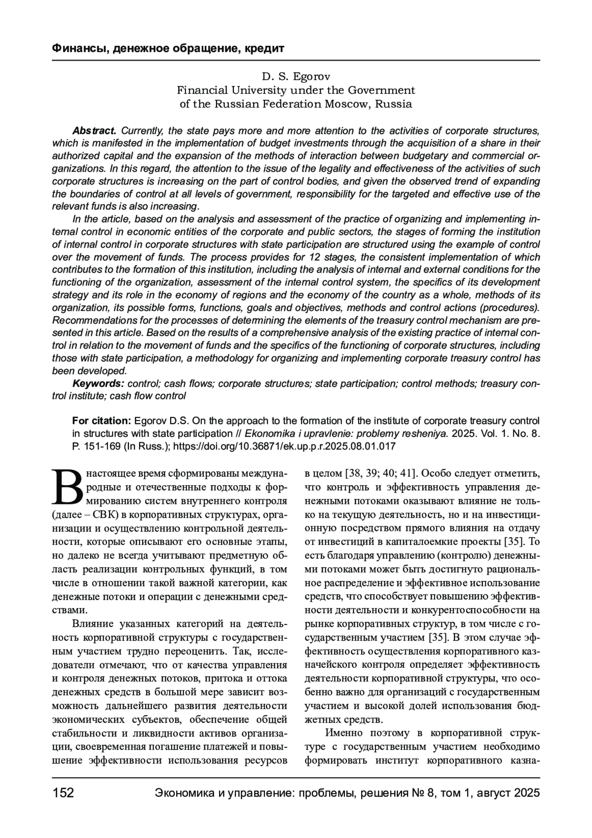 ЕГОРОВ Д. С. О ПОДХОДЕ К ФОРМИРОВАНИЮ ИНСТИТУТА КОРПОРАТИВНОГО КАЗНАЧЕЙСКОГО КОНТРОЛЯ В СТРУКТУРАХ С ГОСУДАРСТВЕННЫМ УЧАСТИЕМ // ЭКОНОМИКА И УПРАВЛЕНИЕ: ПРОБЛЕМЫ, РЕШЕНИЯ. 2025. ТОМ 1 № 8