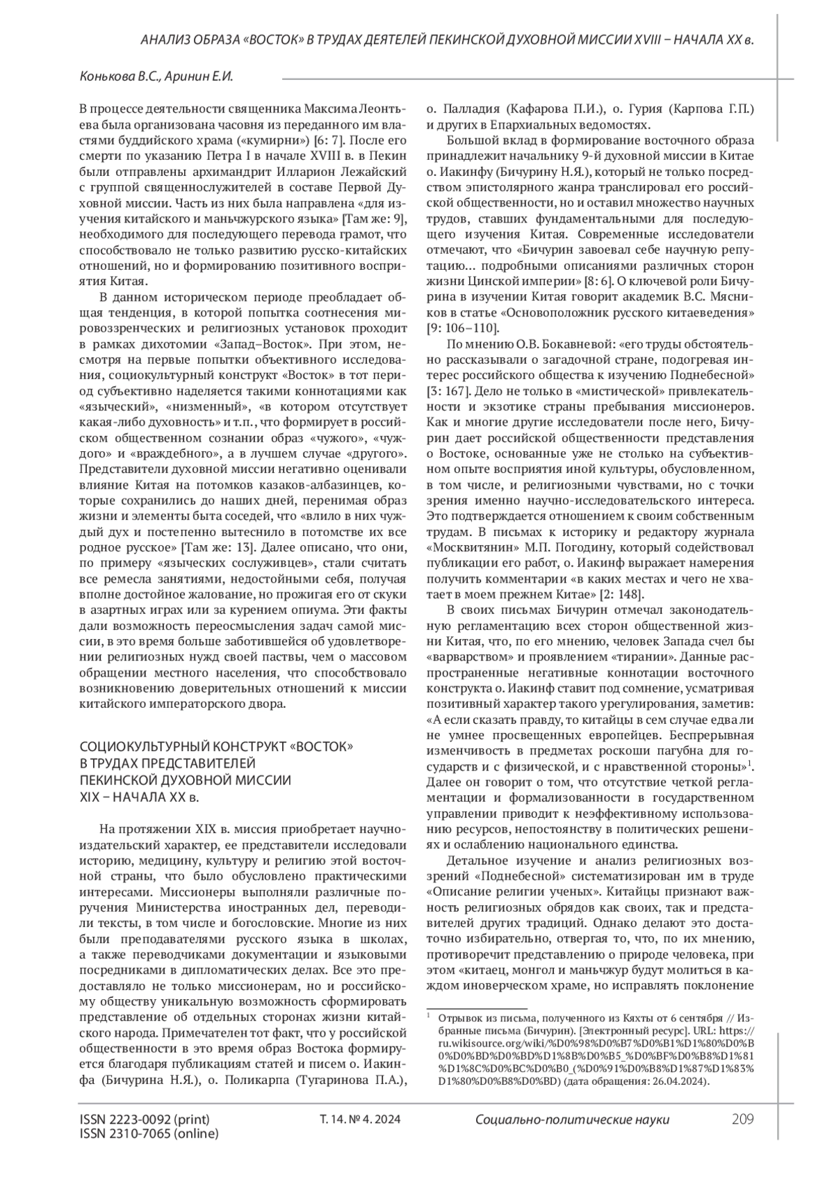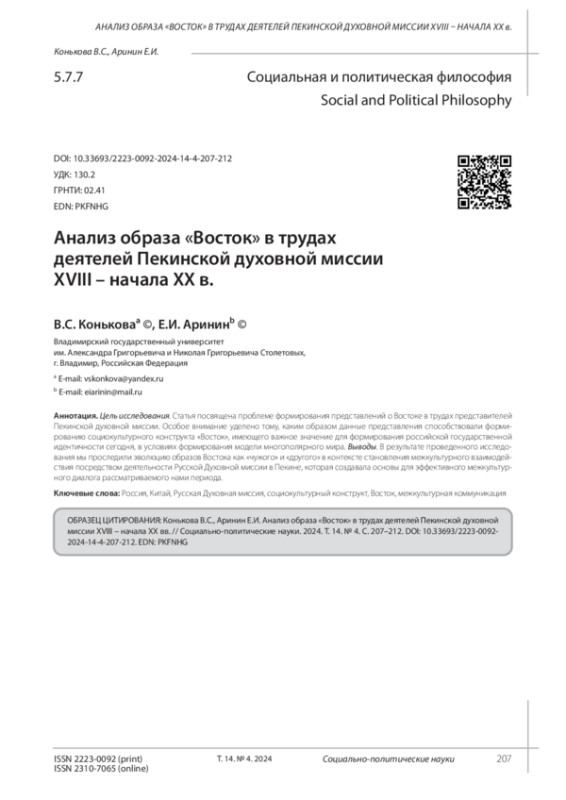 В настоящее время вновь становится актуальным вопрос изучения культурной специфики стран Востока, поскольку развитие сотрудничества между нашей страной и государствами Азии невозможно без понимания особенностей каждой из них. Именно сейчас, в условиях формирования многополярного мира и интенсификации сотрудничества России со странами Aзии (в частности, с Китаем), данная проблема приобретает особую значимость. Поэтому нам следует обратиться к истокам осмысления этой проблематики – опыту деятельности Русской Духовной миссии, которая не ограничивалась только духовной сферой, поскольку в ее основе лежало формирование политических, экономических и социальных связей. Для этого мы обратимся к образу Востока, сформированному в ходе развития русской православной миссии.