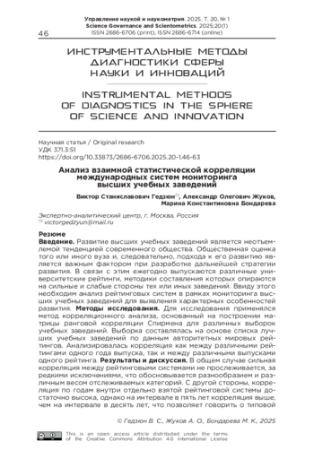 ГЕДЗЮН В. С., ЖУКОВ А. О., БОНДАРЕВА М. К. АНАЛИЗ ВЗАИМНОЙ СТАТИСТИЧЕСКОЙ КОРРЕЛЯЦИИ МЕЖДУНАРОДНЫХ СИСТЕМ МОНИТОРИНГА ВЫСШИХ УЧЕБНЫХ ЗАВЕДЕНИЙ // УПРАВЛЕНИЕ НАУКОЙ И НАУКОМЕТРИЯ. 2025. Т. 20 № 1