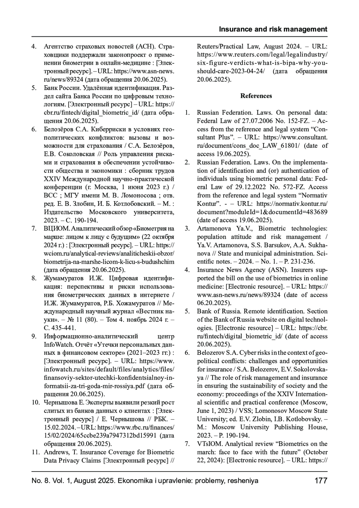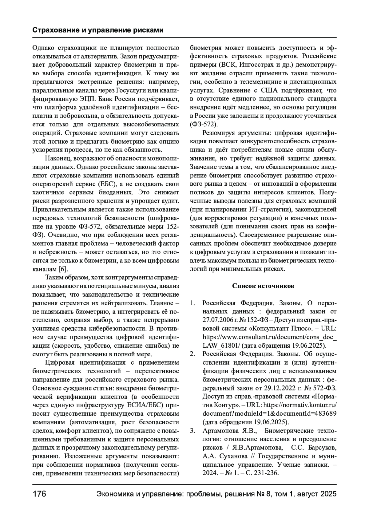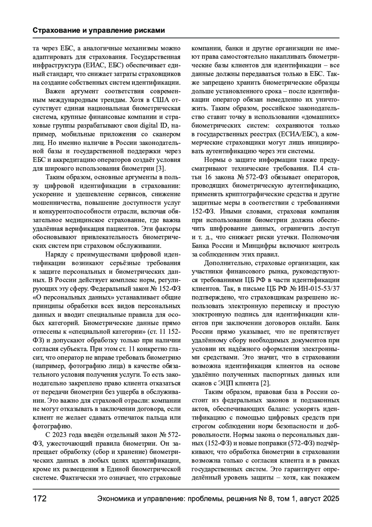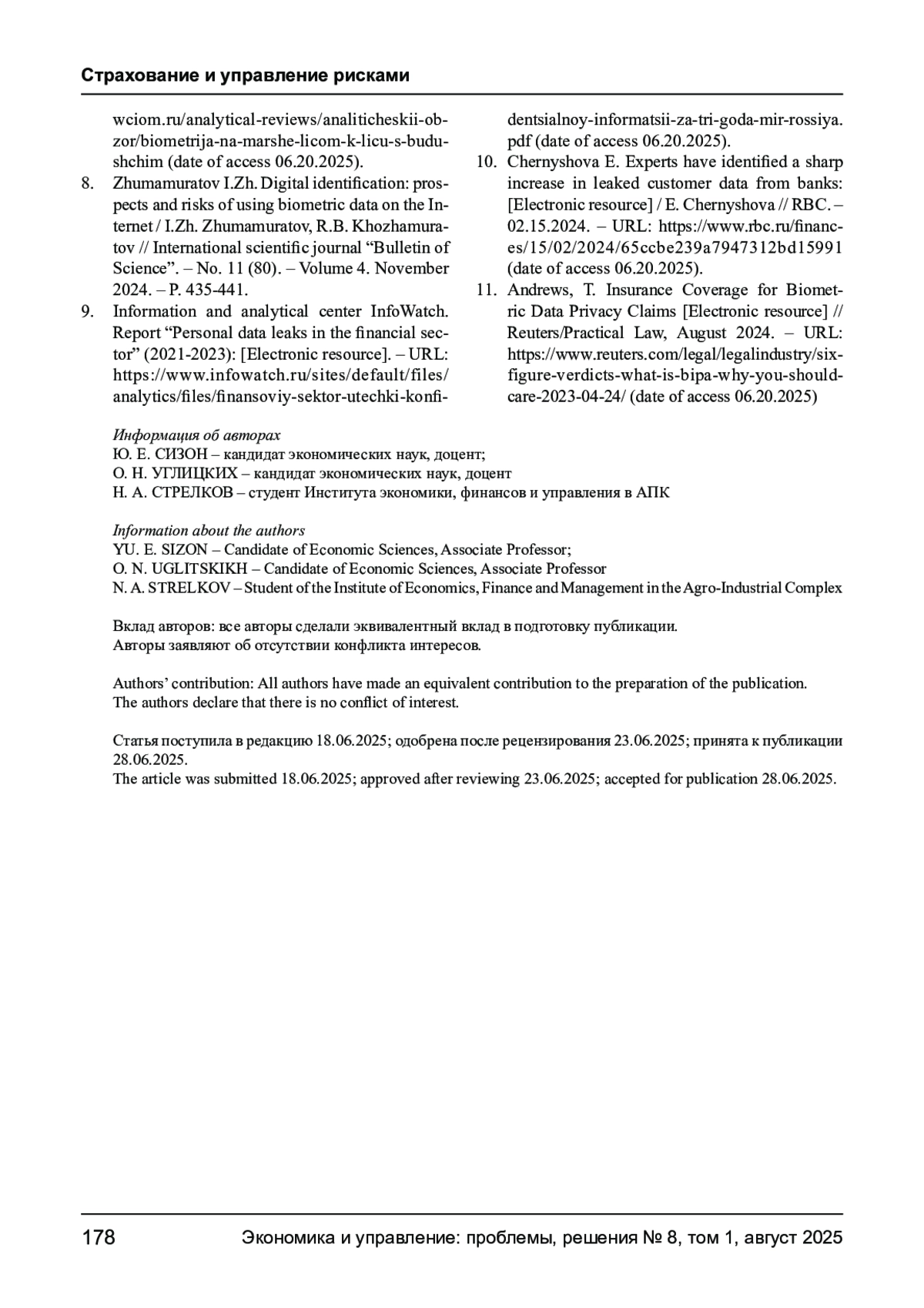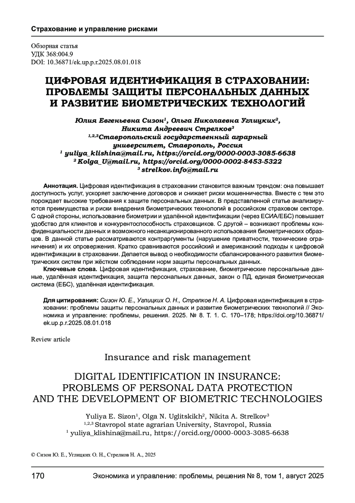 СИЗОН Ю. Е., УГЛИЦКИХ О. Н., СТРЕЛКОВ Н. А. ЦИФРОВАЯ ИДЕНТИФИКАЦИЯ В СТРАХОВАНИИ: ПРОБЛЕМЫ ЗАЩИТЫ ПЕРСОНАЛЬНЫХ ДАННЫХ И РАЗВИТИЕ БИОМЕТРИЧЕСКИХ ТЕХНОЛОГИЙ // ЭКОНОМИКА И УПРАВЛЕНИЕ: ПРОБЛЕМЫ, РЕШЕНИЯ. 2025. ТОМ 1 № 8