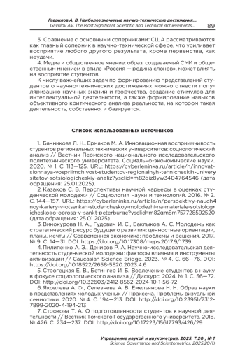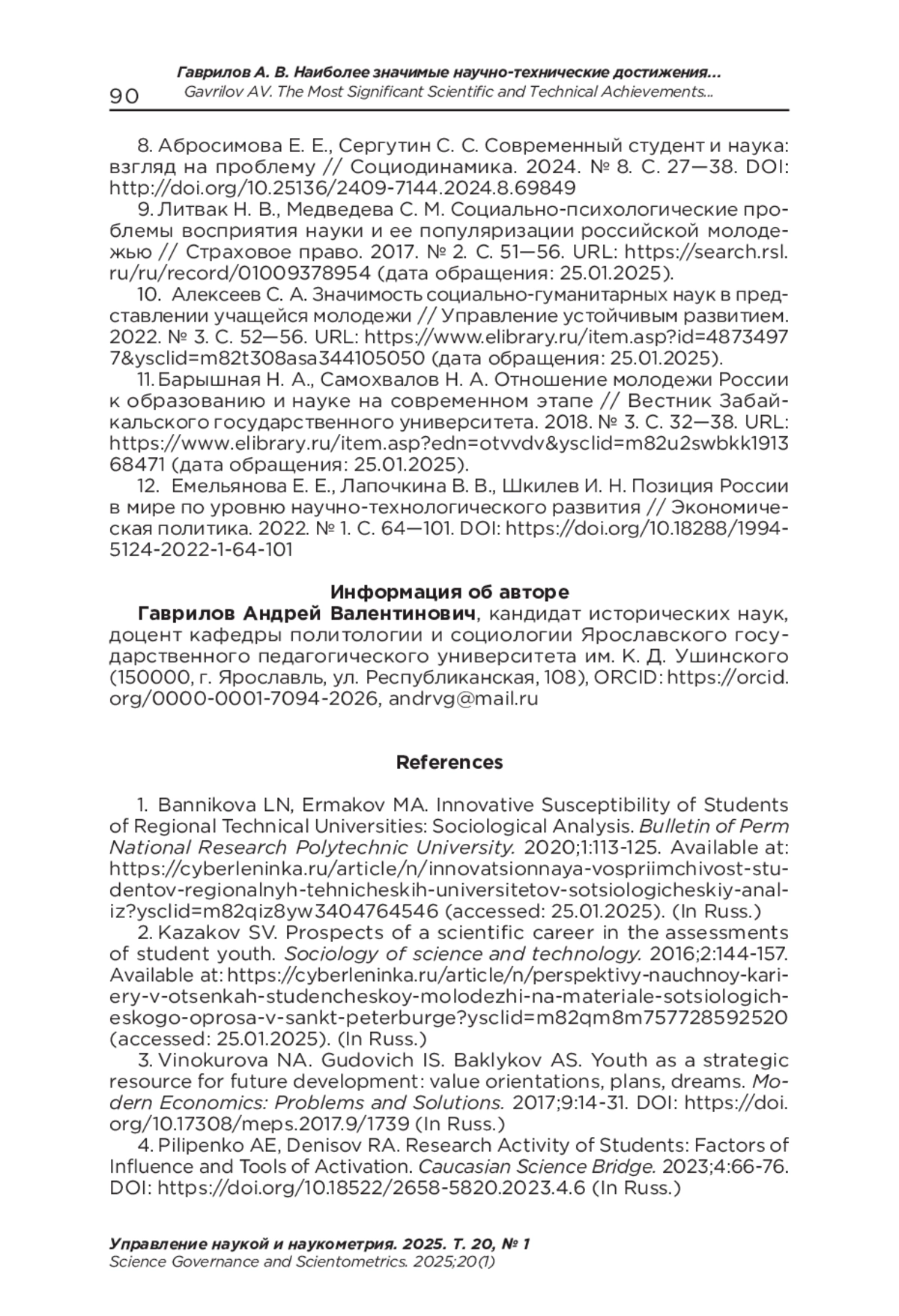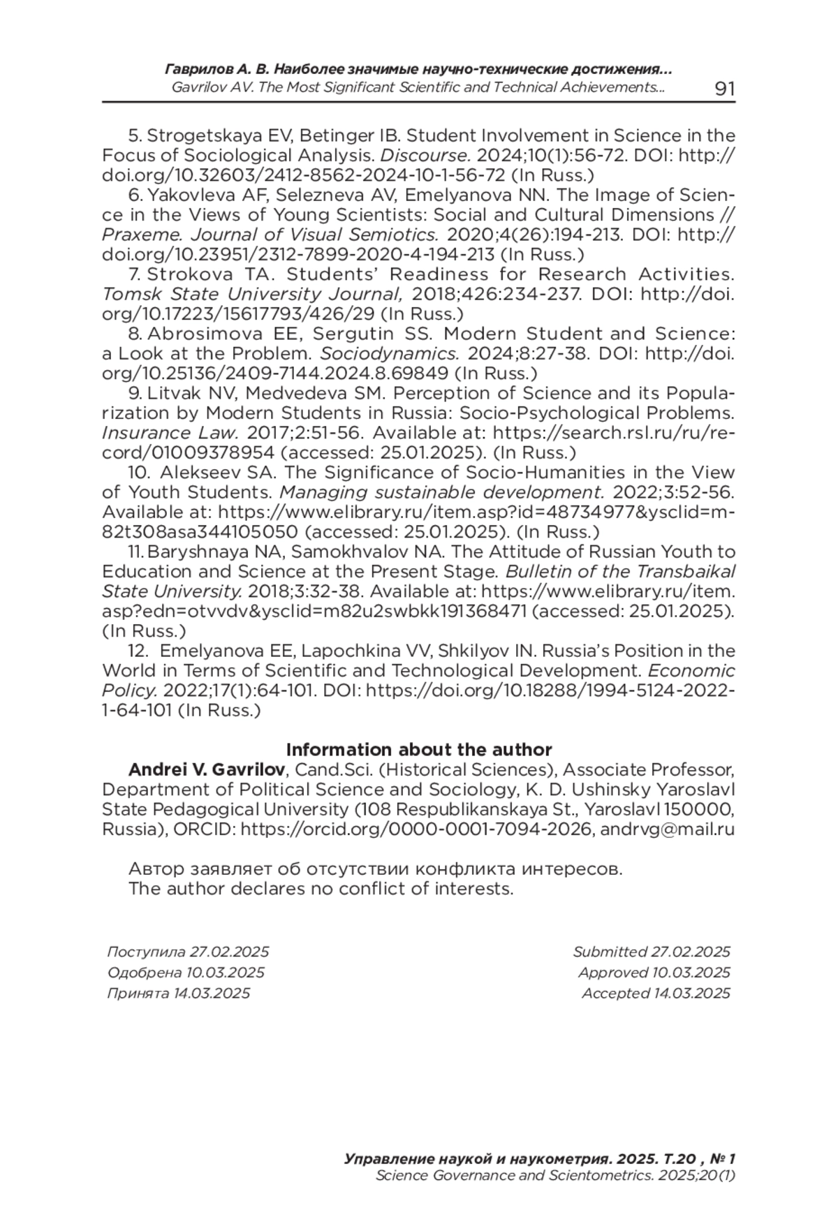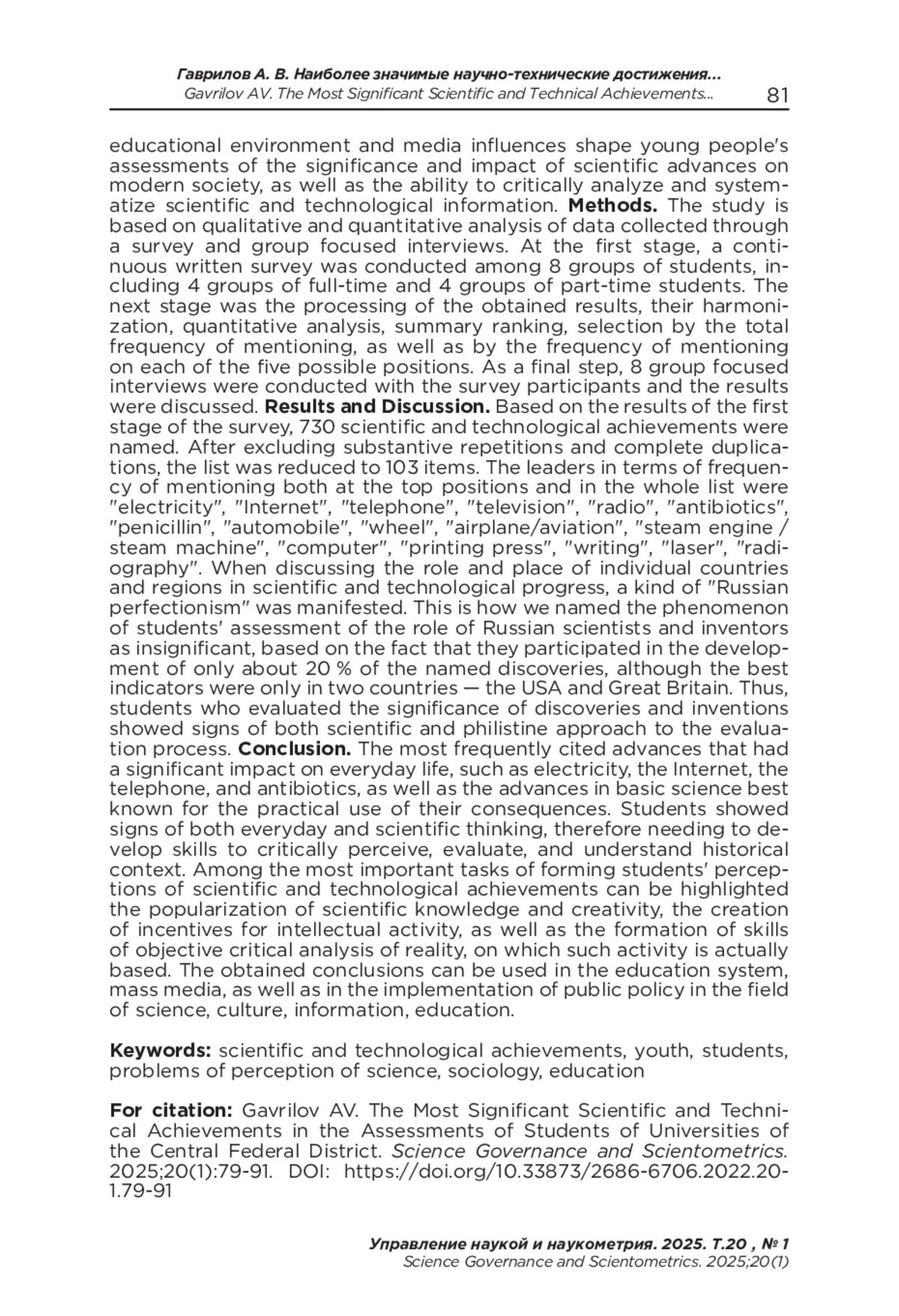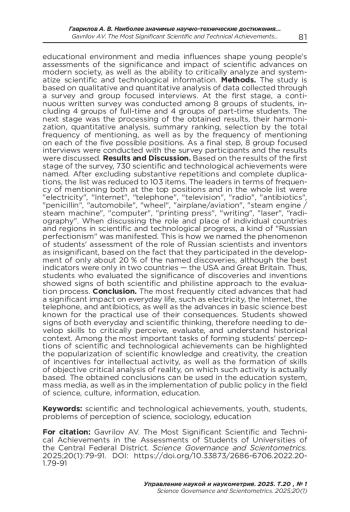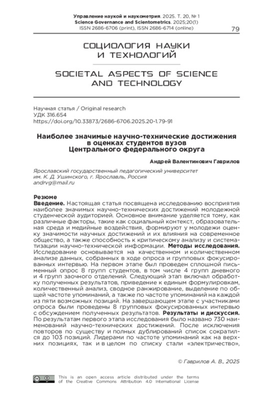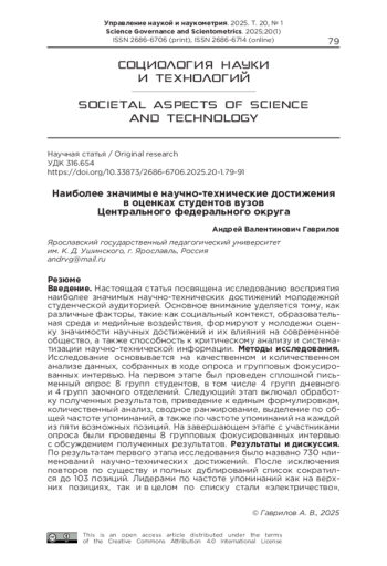 ГАВРИЛОВ А. В. НАИБОЛЕЕ ЗНАЧИМЫЕ НАУЧНО-ТЕХНИЧЕСКИЕ ДОСТИЖЕНИЯ В ОЦЕНКАХ СТУДЕНТОВ ВУЗОВ ЦЕНТРАЛЬНОГО ФЕДЕРАЛЬНОГО ОКРУГА // УПРАВЛЕНИЕ НАУКОЙ И НАУКОМЕТРИЯ. 2025. Т. 20 № 1