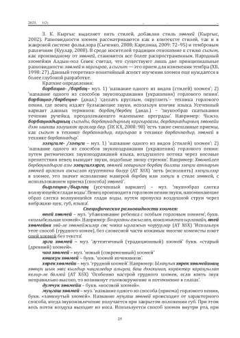Дефиниция музыкальных терминов иногда подверженадескриптивному подходу, особенно в наименованиях инструментов, видов горлового пения и объяснениях заимствованных терминов. Словарные статьи не всегда содержат полныеэтимологические справки, сведения о времени фиксации висточниках и иллюстрации из художественной литературы исредств массовой информации. В первой части исследования(см. журнал за 2024 год) были представлены результаты по Первой группе терминов, обозначающих общее название горлового пения хоомей. Вовторой части исследования представлены результаты по группам терминов, обозначающих: разновидности горлового пения хоомей; специфические образовательные термины; иприемы корректировки дыхания во время исполнения хоомея.