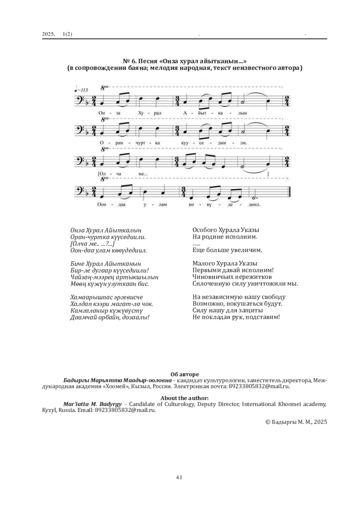 7. Ноозун О. Х. Тываның Улустуң хөөмейжизи Г.Х. Туматтың допчу-намдары болгаш чогаадыкчы ажыл-ижи [О жизни и творчестве Народного хоомейжи Республики Тыва Г. Х. Тумата] // Хоомей и культурное наследие народов Центральной Азии. 2024. № 1(1). С. 123-133. (на тув. яз.). EDN: BGHKOI