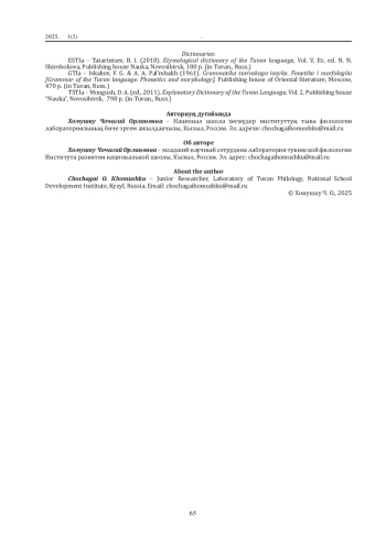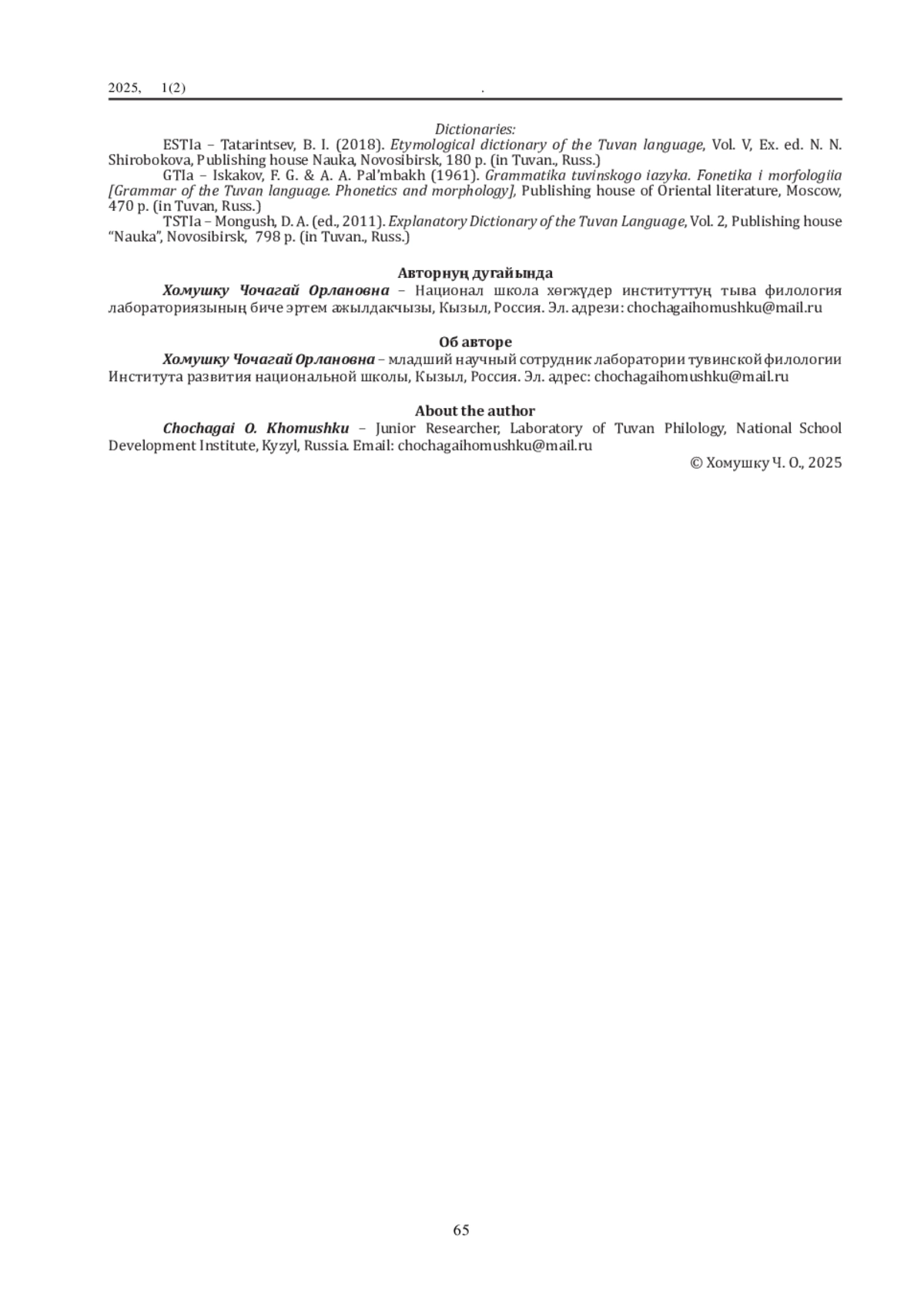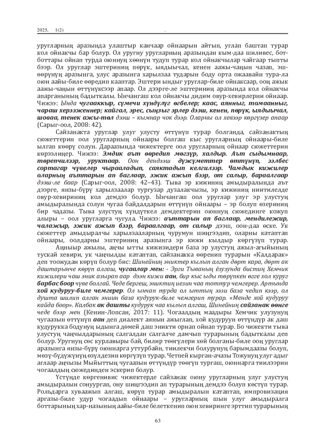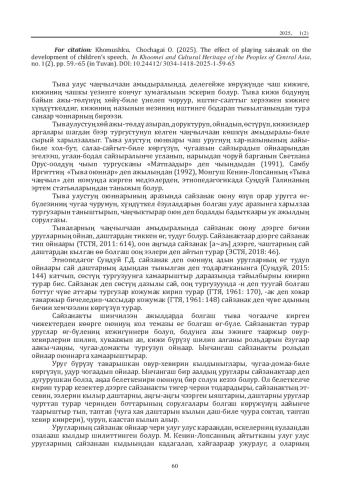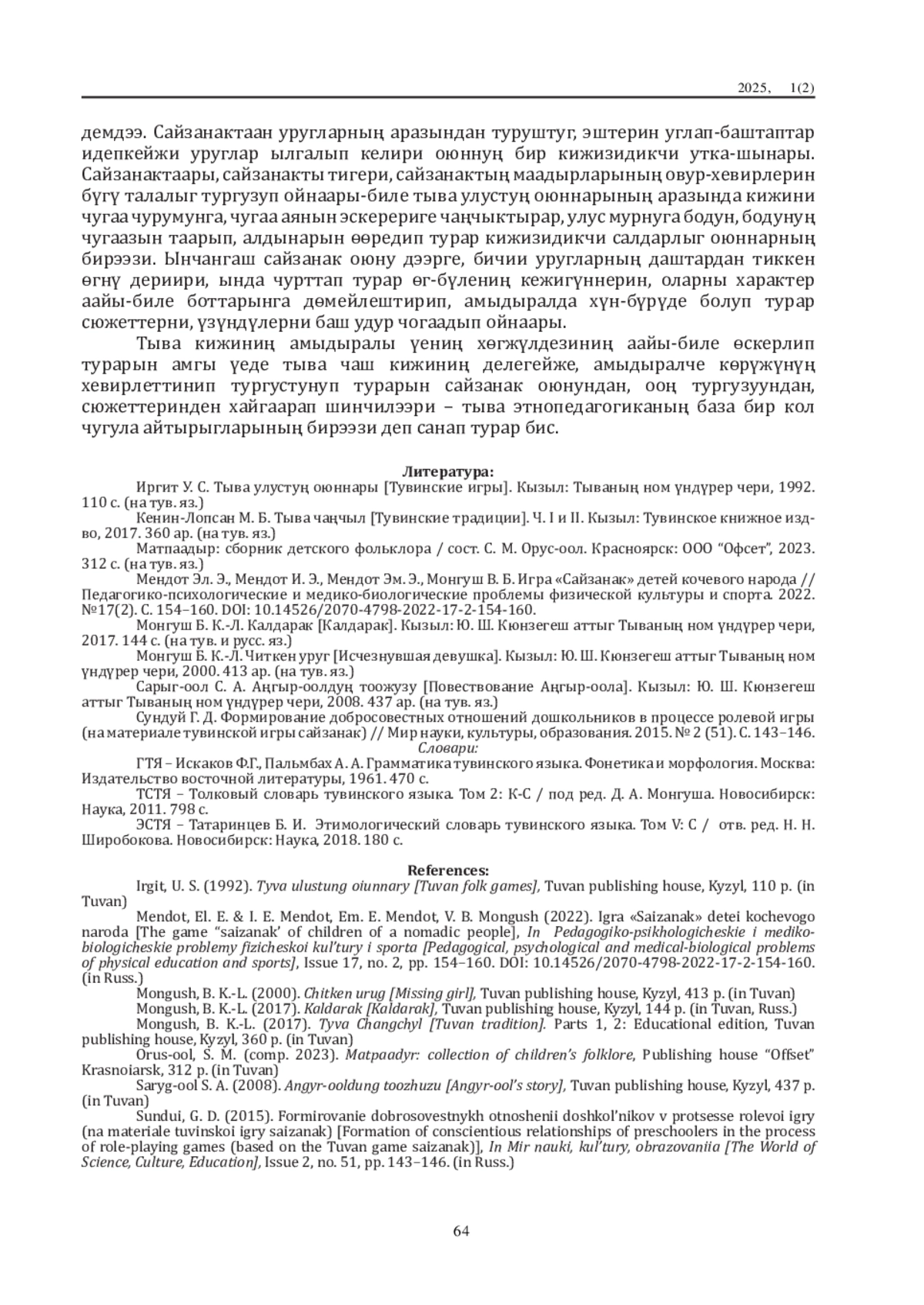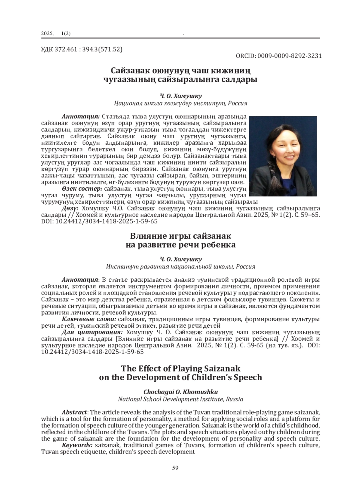 ХОМУШКУ Ч. О. ВЛИЯНИЕ ИГРЫ САЙЗАНАК НА РАЗВИТИЕ РЕЧИ РЕБЕНКА // ХООМЕЙ И КУЛЬТУРНОЕ НАСЛЕДИЕ НАРОДОВ ЦЕНТРАЛЬНОЙ АЗИИ. 2025. № 1