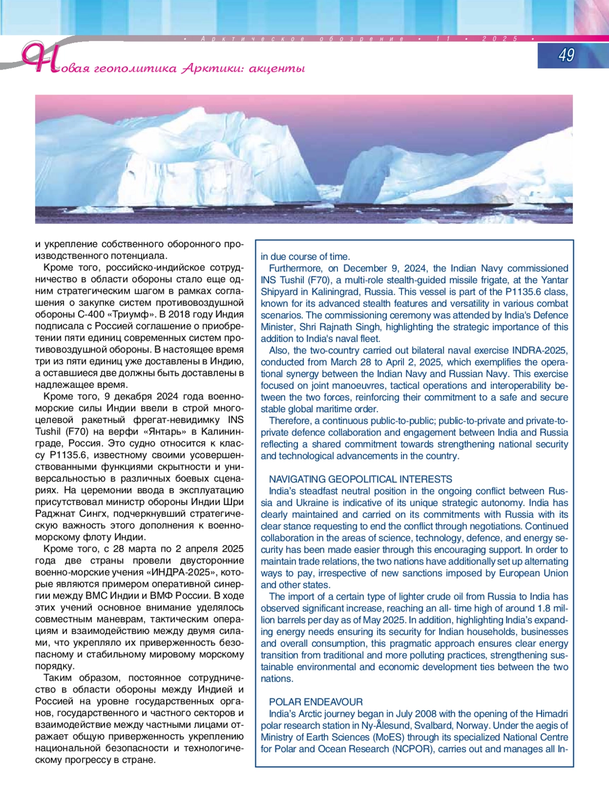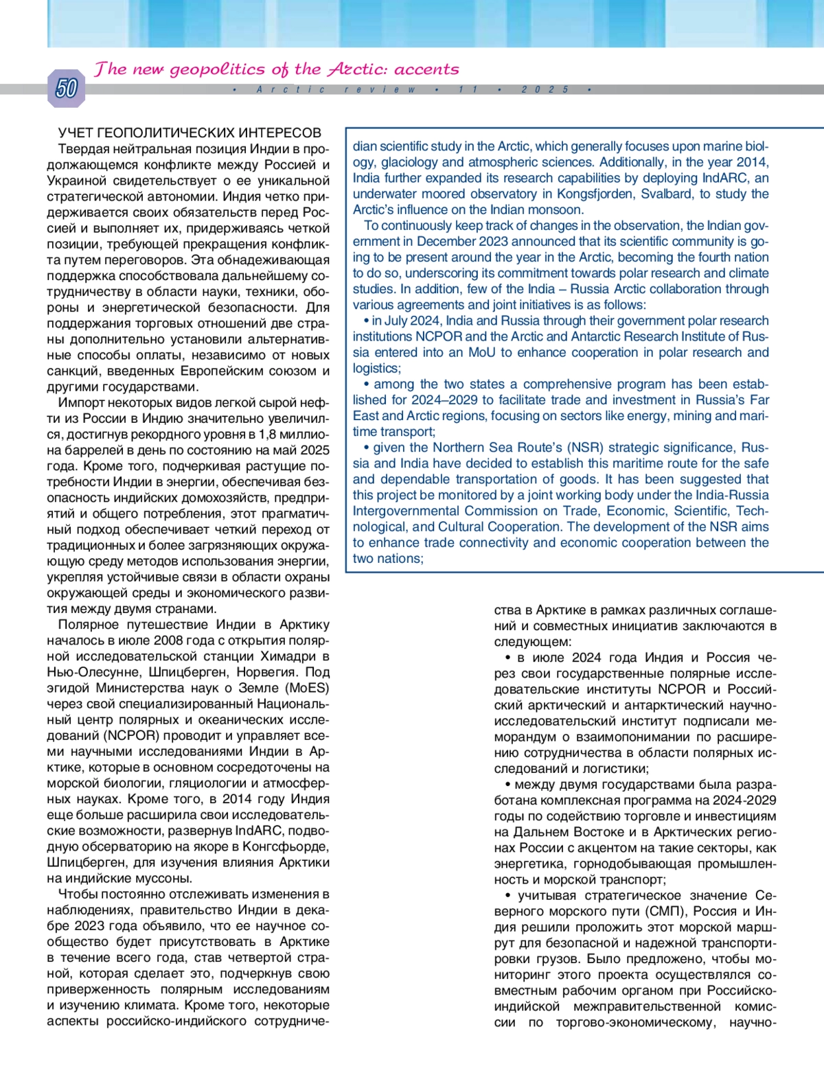 В современном динамичном мире с разнообразными ландшафтами и расходящимися национальными интересами борьба за природные ресурсы значительно усилила напряженность в Арктическом регионе, что полностью изменило регион в геополитическом плане. Географическое положение Российской Федерации, занимающей более 53% территории Арктического региона, позволяет ей возглавлять любое стратегическое взаимодействие, защищая свои собственные стратегические интересы. Принимая во внимание, что Индия с ее Арктической политикой до 2022 года, критическими научными исследованиями и устойчивыми практиками, а также прочным партнерством с Россией, твердо намерена сотрудничать на постоянно развивающемся театре военных действий, ориентируясь на согласованные национальные интересы, экономическую надежность, энергетическую безопасность, научные исследования и стратегическую приверженность во главу угла.