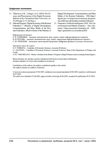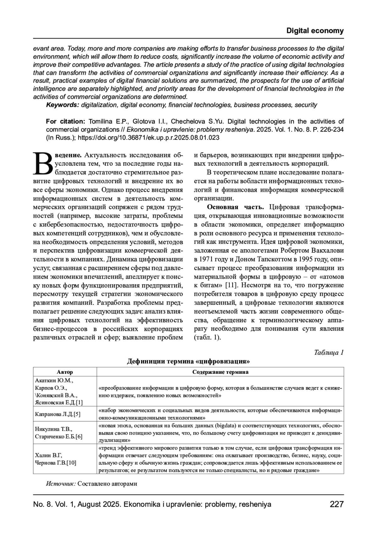 ТОМИЛИНА Е. П., ГЛОТОВА И. И., ЧЕЧЕЛОВА С. Ю. ЦИФРОВЫЕ ТЕХНОЛОГИИ В ДЕЯТЕЛЬНОСТИ КОММЕРЧЕСКИХ ОРГАНИЗАЦИЙ // ЭКОНОМИКА И УПРАВЛЕНИЕ: ПРОБЛЕМЫ, РЕШЕНИЯ. 2025. ТОМ 1 № 8