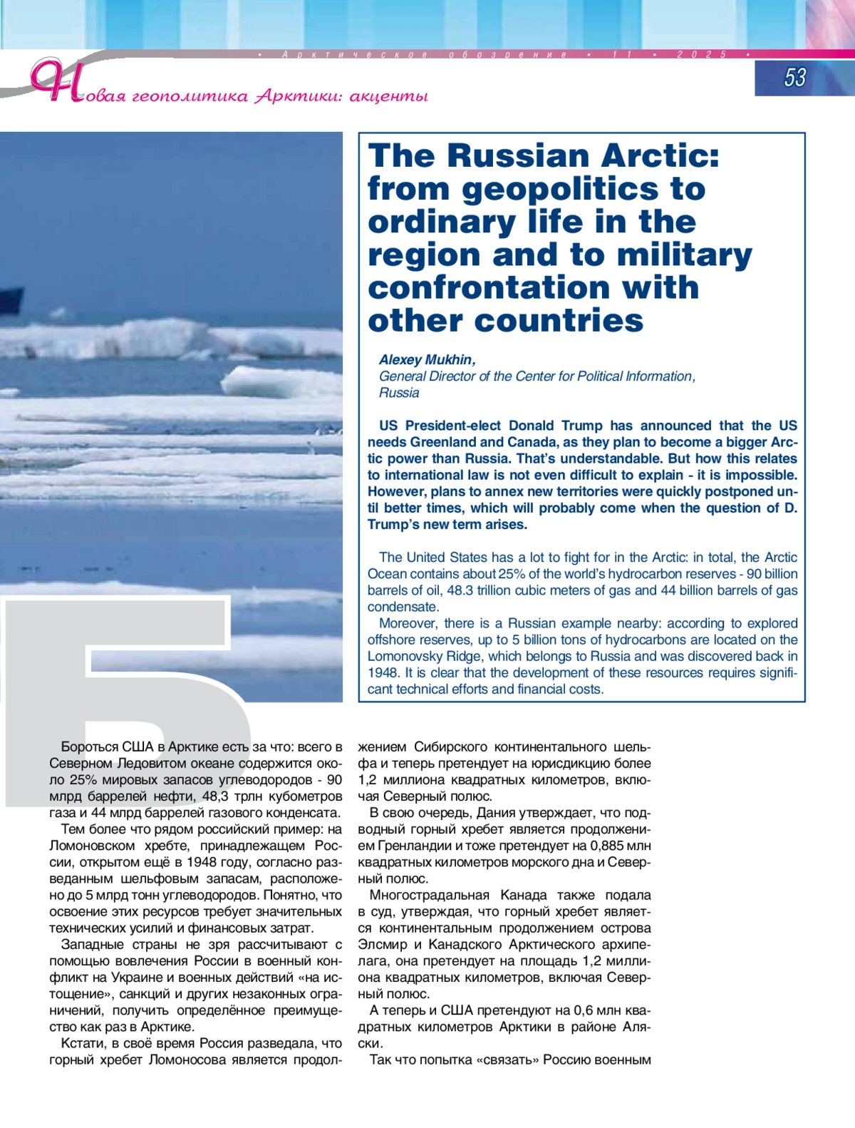 МУХИН А. А. АРКТИКА: ОТ ГЕОПОЛИТИКИ К ОБЫЧНОЙ ЖИЗНИ В РЕГИОНЕ И К ВОЕННОМУ ПРОТИВОСТОЯНИЮ С ДРУГИМИ СТРАНАМИ // АРКТИЧЕСКОЕ ОБОЗРЕНИЕ. 2025. № 11